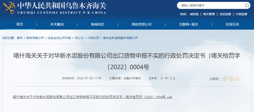 日前,乌鲁木齐海关发布一则行政处罚决定书,其中提到2022年6月30日,华新水泥股份有限公司委托新疆中亚联盟国际物流有限公司申报一批出口货物,报关单号为9408202200001176,运输工具号为新P12388。