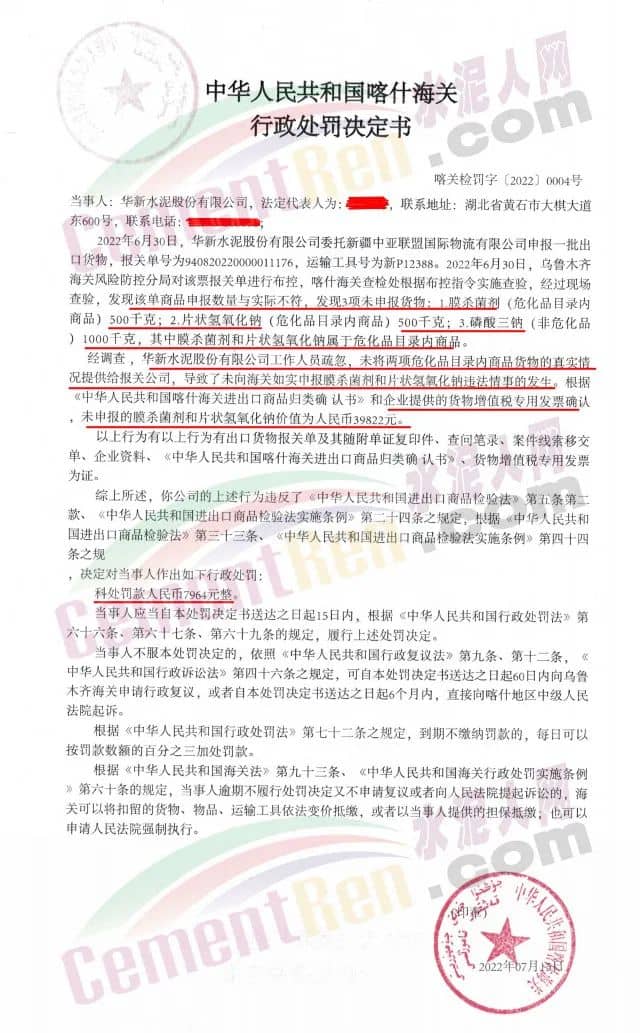 经调查,华新水泥股份有限公司工作人员疏忽,未将两项危化品目录内商品货物的真实情况提供给报关公司,导致了未向海关如实申报膜杀菌剂和片状氢氧化钠违法情事的发生。