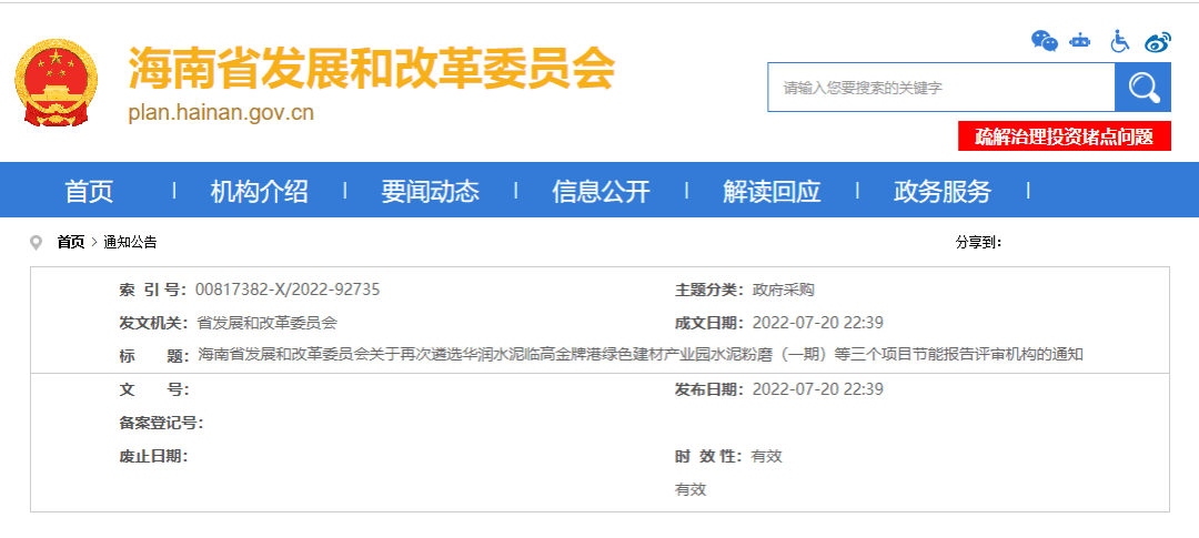 日前,海南省发改委发布《关于再次遴选华润水泥临高金牌港绿色建材产业园水泥粉磨(一期)等三个项目节能报告评审机构的通知》称,根据《海南省固定资产投资项目节能审查实施办法》(琼府〔2017〕47号)等有关规定,我委拟公开遴选1家评审机构承担华润水泥临高金牌港绿色建材产业园水泥粉磨(一期)等三个项目节能报告评审工作。