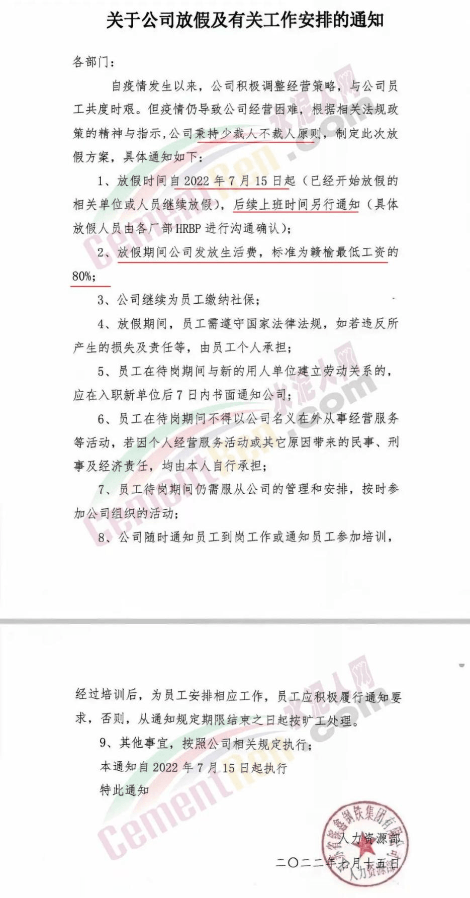 江苏镔鑫钢铁发放假通知称,自2022年7月15日起放假,后续上班时间另行通知;放假期间公司发放生活费,标准为赣榆最低工资的80%……