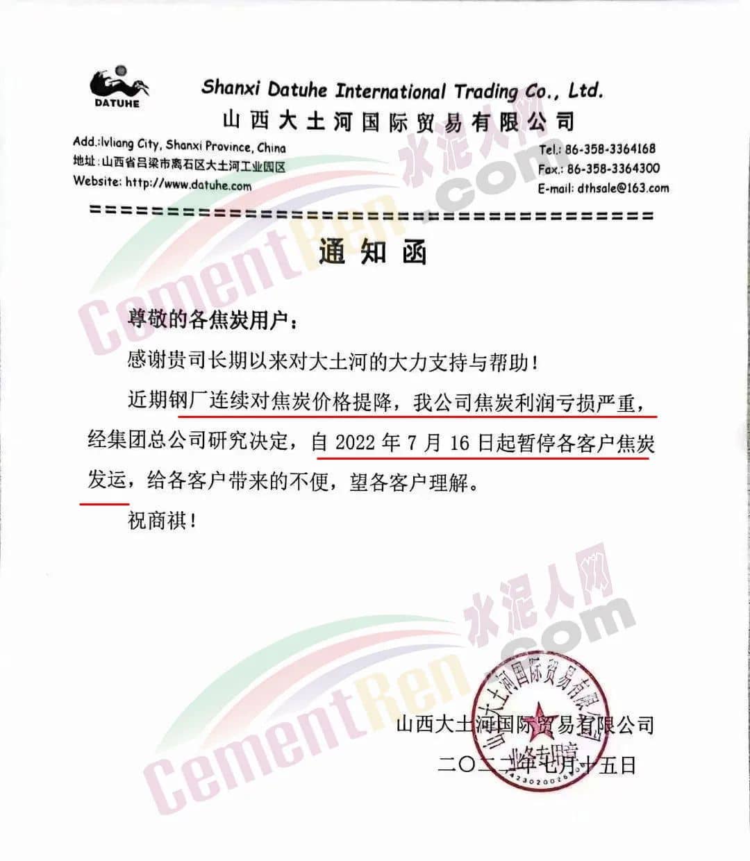 山西大土河国际贸易有限公司发通知函称,近期钢厂连续对焦炭价格提降,公司焦炭利润亏损严重,经集团总公司研究决定,自7月16日起暂停各客户焦炭发运。