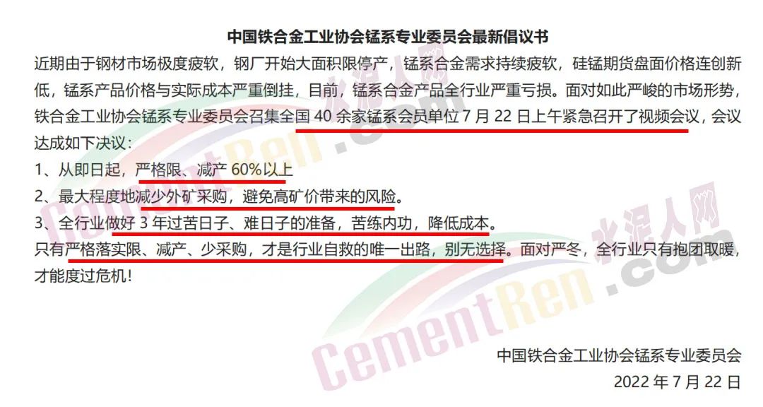 铁合金工业协会锰系专业委员会召集全国40余家锰系会员单位7月22日上午紧急召开了视频会议,会议达成决议:从即日起,严格限、减产60%以上;最大程度地减少外矿采购,避免高矿价带来的风险;全行业做好3年过苦日子、难日子的准备,苦练内功,降低成本。