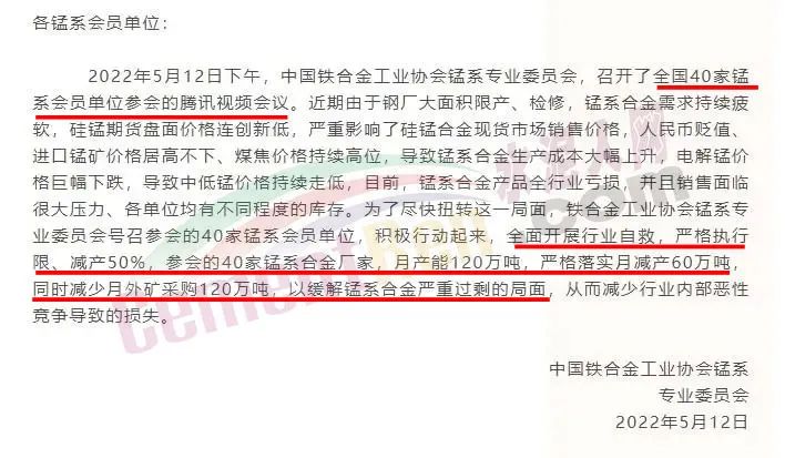 据了解,早在5月中旬,中国铁合金工业协会锰系专业委员会就召开了全国40家锰系会员单位参会的腾讯视频会议。