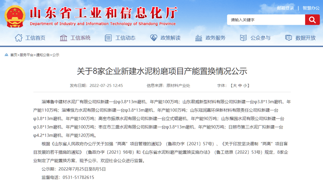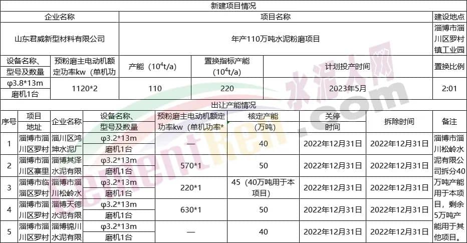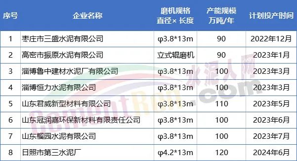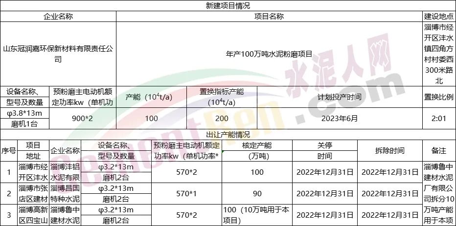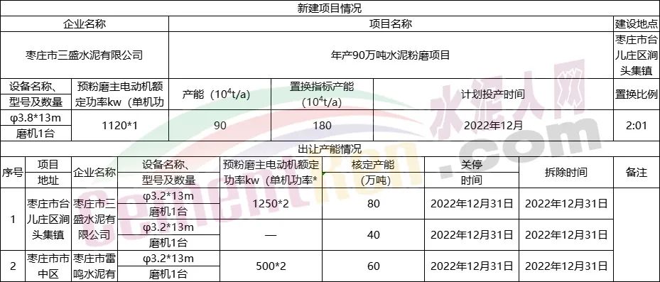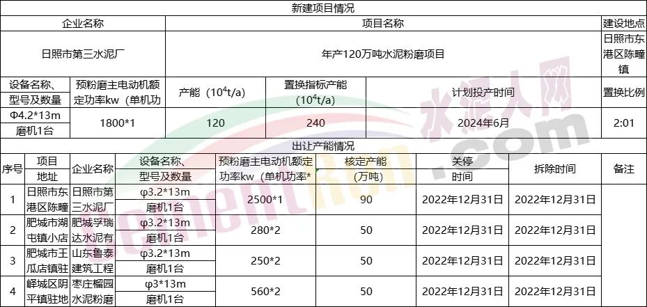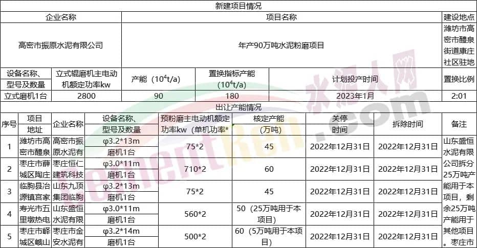 日前,山东省工信厅发布《关于8家企业新建水泥粉磨项目产能置换情况公示》称,根据相关文件规定,8家企业制定了产能置换方案。置换比例全部为2:1,新建线产能规模为90~120万吨/年,拟投产日期从2022年12月至2024年6月,合计产能达810万吨/年,详情如下: