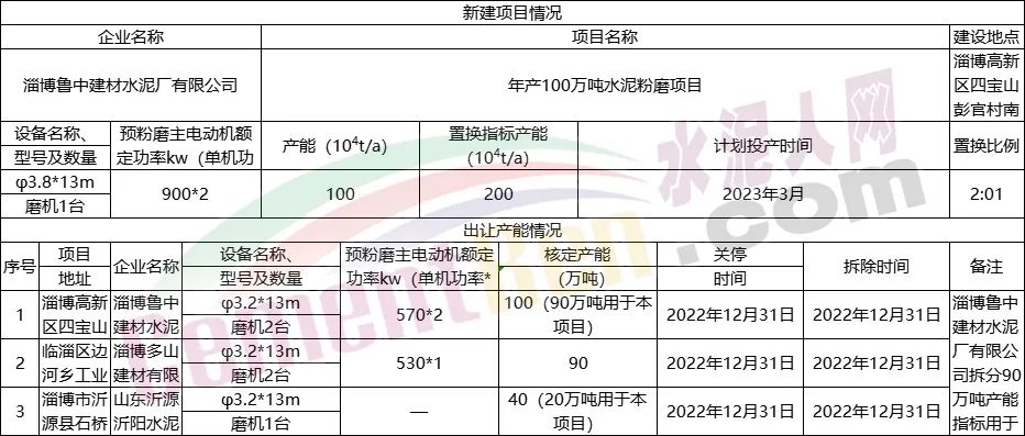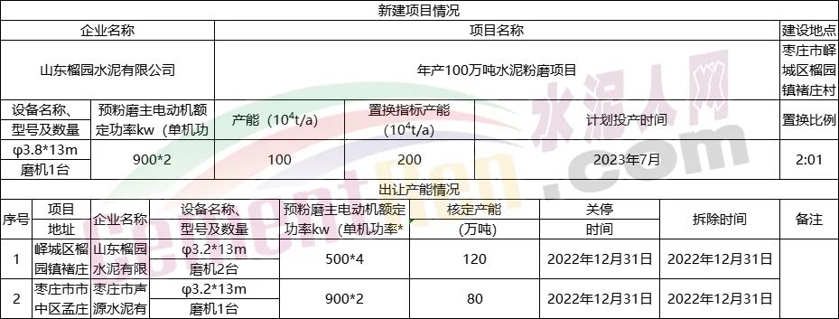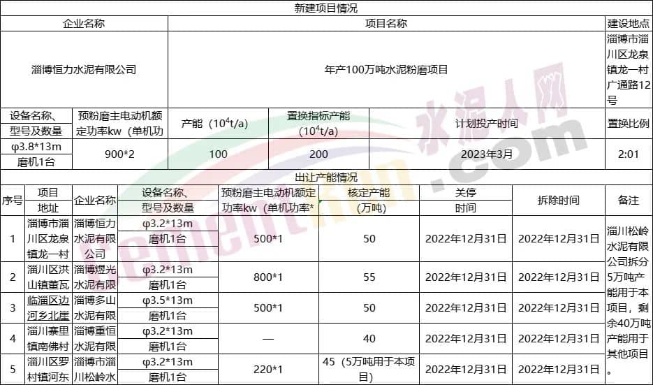 年产100万吨水泥粉磨项目产能置换情况表