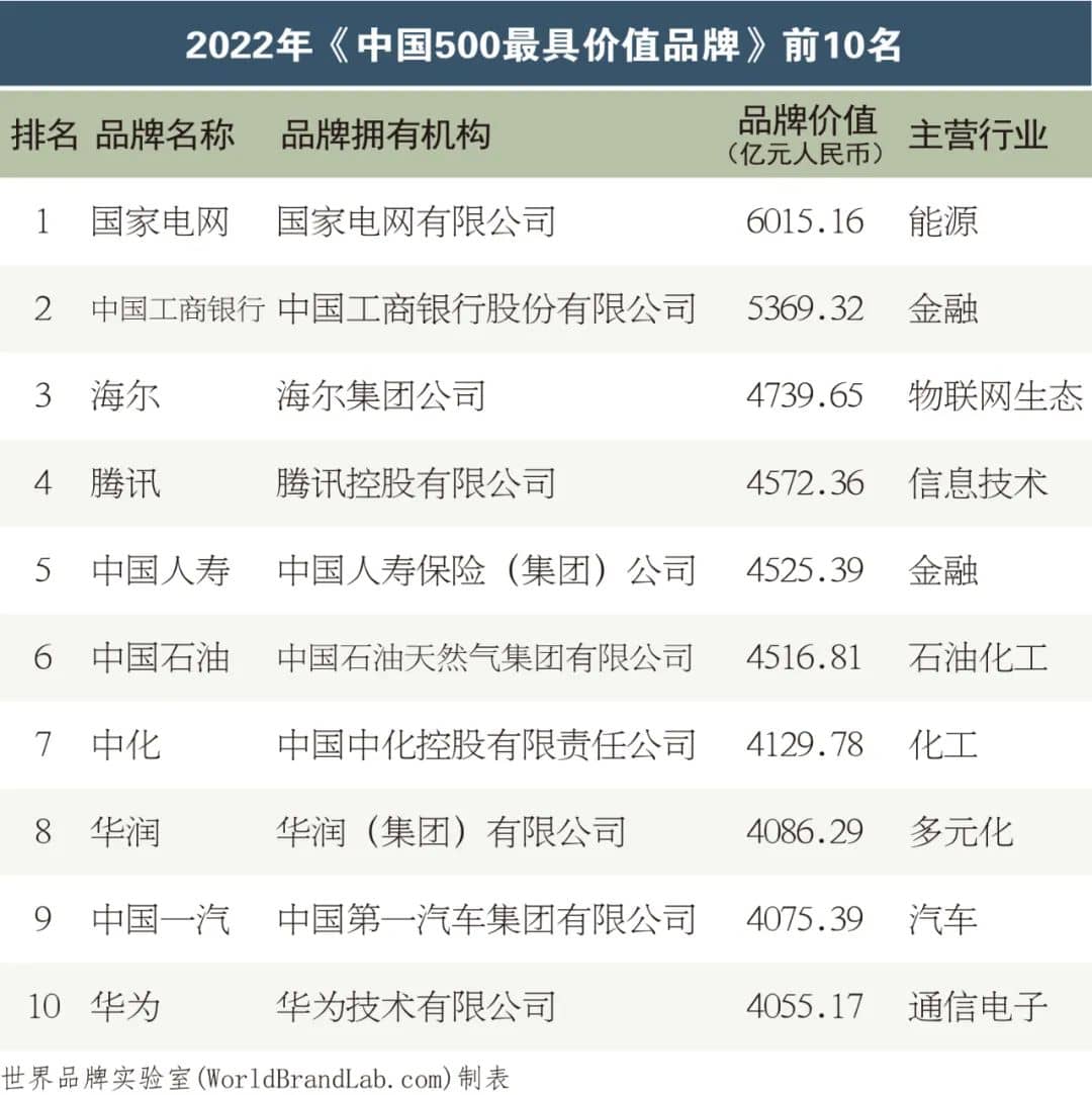 由世界品牌实验室(World Brand Lab)主办的(第十九届)“世界品牌大会”于7月26日在北京举行,会上发布了2022年《中国500最具价值品牌》分析报告。在这份基于财务数据、品牌强度和消费者行为分析的年度报告中,国家电网以6015.16亿元的品牌价值荣登本年度最具价值品牌榜首。占据榜单前五名的还有中国工商银行(5369.32亿元)、海尔(4739.65亿元)、腾讯(4572.36亿元)、中国人寿(4525.39亿元),这些品牌已经迈进世界级品牌阵营。来自哈佛、耶鲁、牛津、欧洲工商管理学院、伦敦大学学院的管理大师们出席了“世界品牌大会”并做在线演讲,围绕“气与势:如何重建品牌生态系统”的大会主题与现场嘉宾互动研讨。