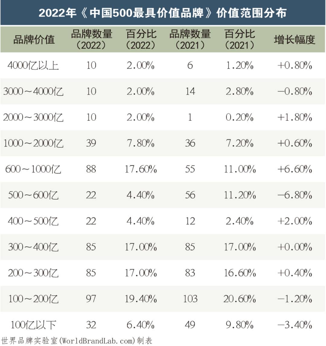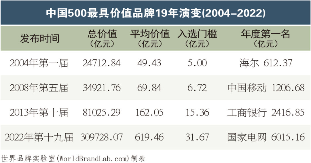 2022年《中国500最具价值品牌》的总价值为309728.07亿元,比去年增加30774.87亿元,增加幅度为11.03%。世界品牌实验室学术委员会主席、牛津大学(Oxford)营销学荣誉教授斯蒂芬·沃格(Steve Woolgar)表示:“品牌是一个国家的形象,我希望世界上更多的人能够通过中国品牌了解中国的故事。在过去的17年中,我目睹了中国品牌的快速成长,有的已经具有强大的世界影响力”。世界品牌实验室编制中国品牌报告已是第19个年头,2004年入选门槛仅为5亿元,前500名品牌的平均价值为49.43亿元。19年以后的2022年,入选门槛已经提高到31.67亿元,而前500名品牌的平均价值高达619.46亿元,增加幅度为1153.21%。