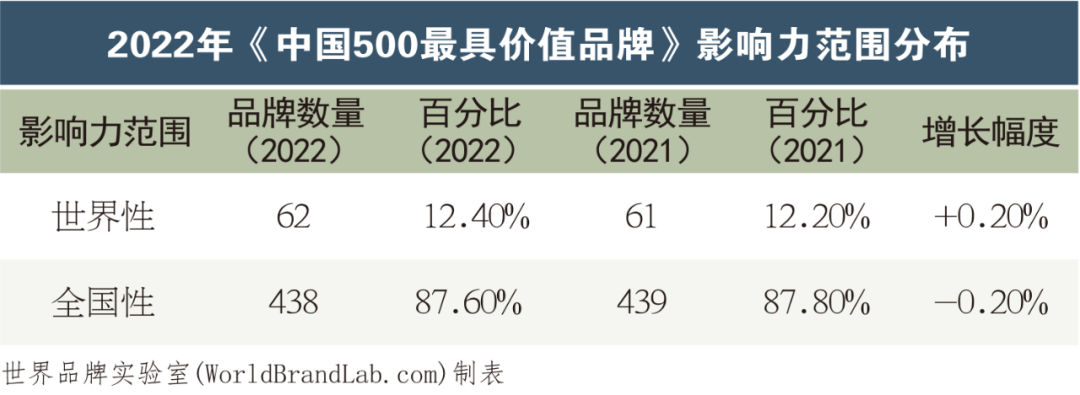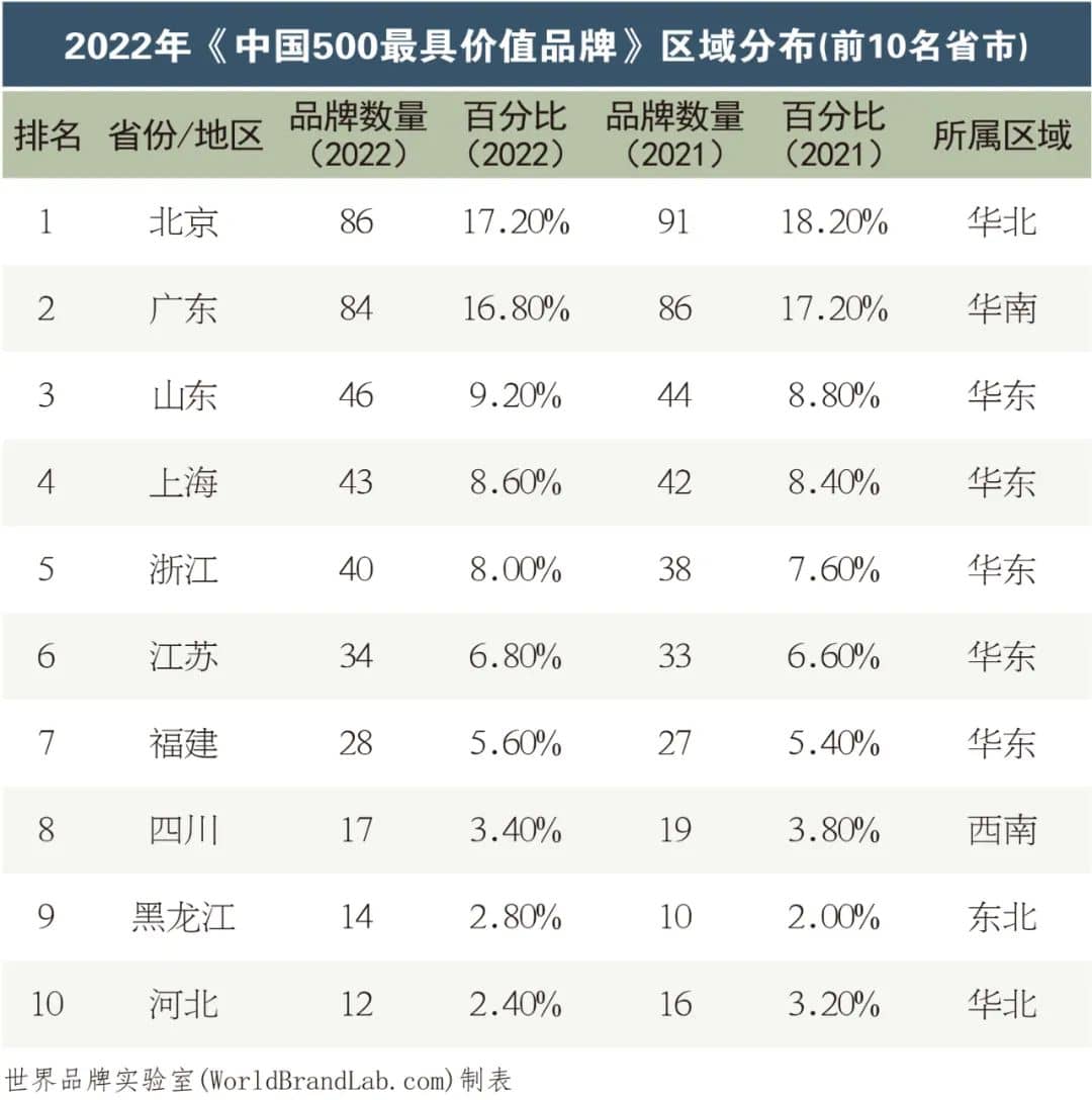 据世界品牌实验室分析,一个区域的竞争实力,主要取决于其比较优势,而品牌效益直接影响着地区比较优势的形成和发展。品牌是一个地区发展的重要标志,品牌带动区域经济的增长,区域经济的发展又促进当地品牌的成长。从本届《中国500最具价值品牌》区域分布来看,北京有86个品牌入选,名列第一,主要原因是赢利能力强的央企总部集中在北京;广东和山东分别有84个和46个品牌入选,位居第二和第三。根据入选品牌影响力范围大小,可按照全国性、世界性品牌进行划分。榜单中具有全国范围影响力的品牌有438个,占87.60%;具有世界性影响力的品牌数为62个,占12.40%,比去年略有增加。