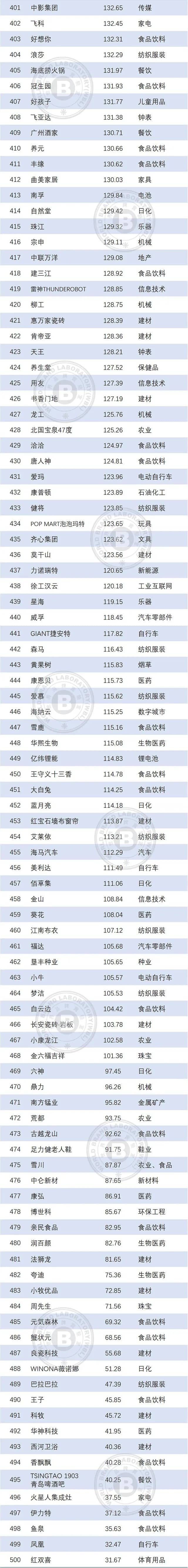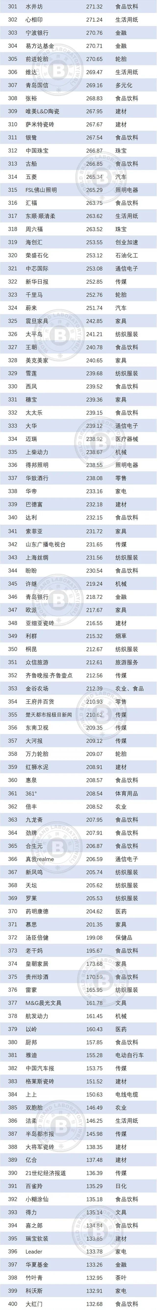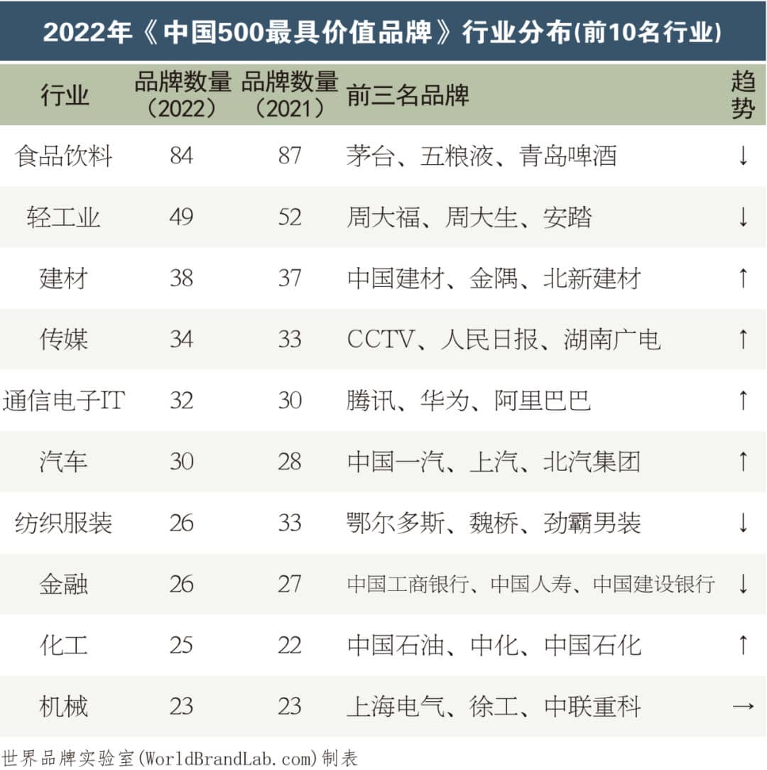 尽管新冠疫情没有阻挡中国品牌价值整体上升的趋势,但是与去年相比,航空、旅游服务、纺织服装、地产、零售等受疫情影响大的行业入榜品牌数量均出现下降,而汽车、通信电子IT、农业等行业入榜品牌均有不同程度增加。本年度《中国500最具价值品牌》排行榜中,共有来自食品饮料、轻工业、建材、传媒、纺织服装、医药、机械等在内的25个相关行业的品牌入选。其中食品饮料业依然是入选品牌最多的行业,共有84个品牌入选,占总入选品牌数的16.80%;入选数量位居第二到第五的行业分别是轻工(49个)、建材(38个)、传媒(34个)、通信电子IT(32个)。本年度共有69个中国品牌的价值超过1000亿,比去年增加了12个。