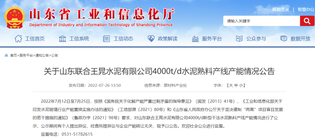 日前,山东工信厅发布公告称,按照相关文件要求,对山东联合王晁水泥有限公司4000t/d新型干法水泥