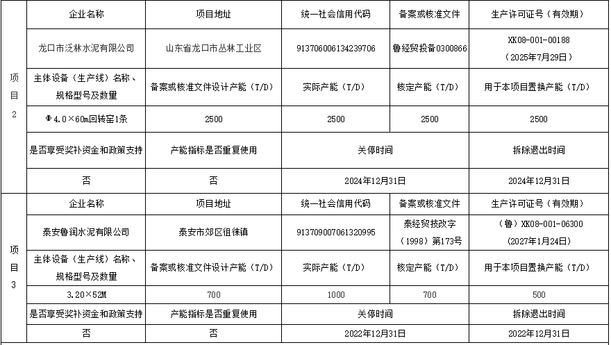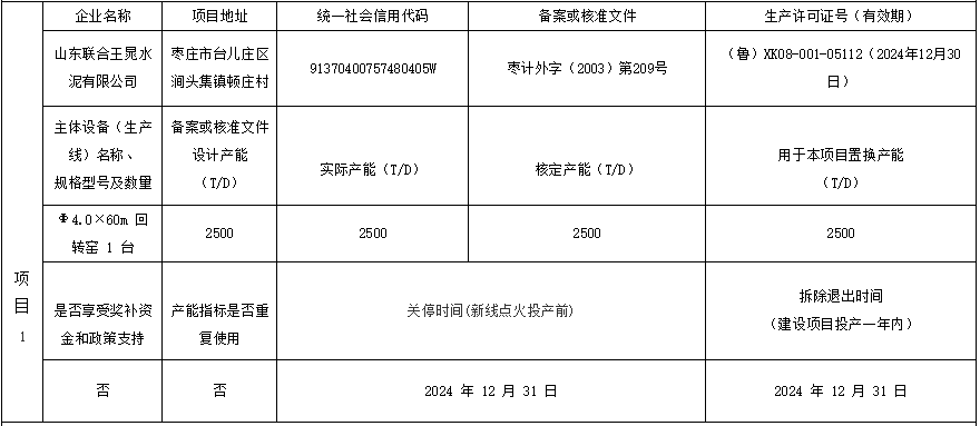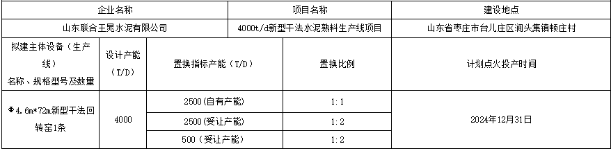 熟料产线产能情况进行公告。项目通过拆除山东联合王晁水泥有限公司自有2500t/d以及龙口市泛林水泥有限公司2500t/d和泰安鲁润水泥有限公司1000t/d熟料生产线新建一条4000t/d熟料生产线,建设地址位于山东省枣庄市台儿庄区涧头集镇顿庄村。拟建主体将采用Φ4.6m*72m