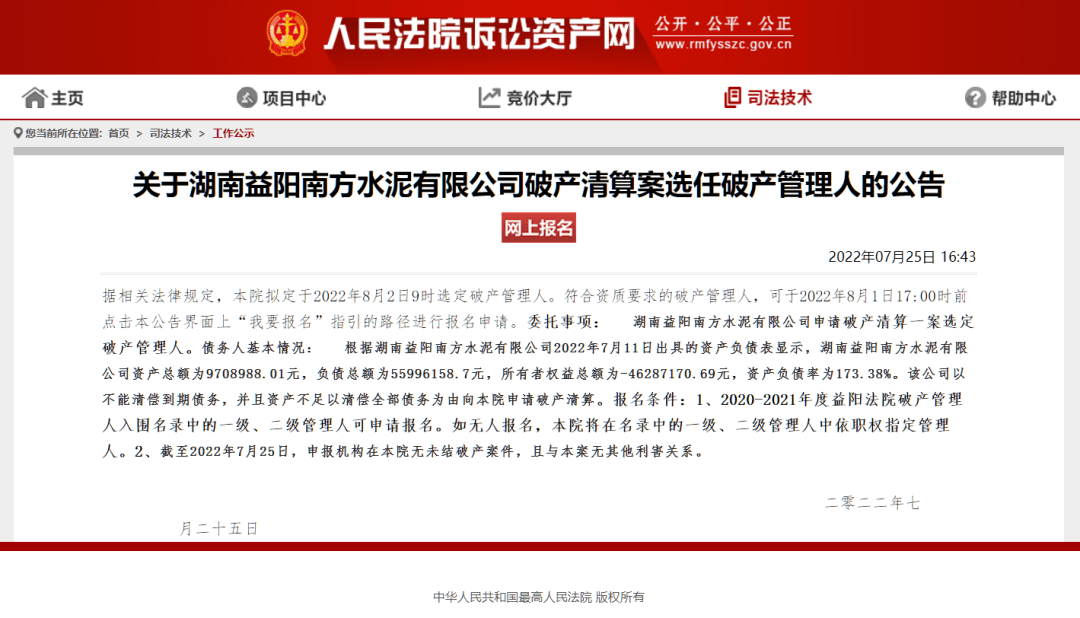日前,人民法院诉讼资产网发布《关于湖南益阳南方水泥有限公司破产清算案选任破产管理人的公告》称,据相关法律规定,法院拟定于2022年8月2日9时选定破产管理人。符合资质要求的破产管理人,可于2022年8月1日17:00时前点击本公告界面上“我要报名”指引的路径进行报名申请。