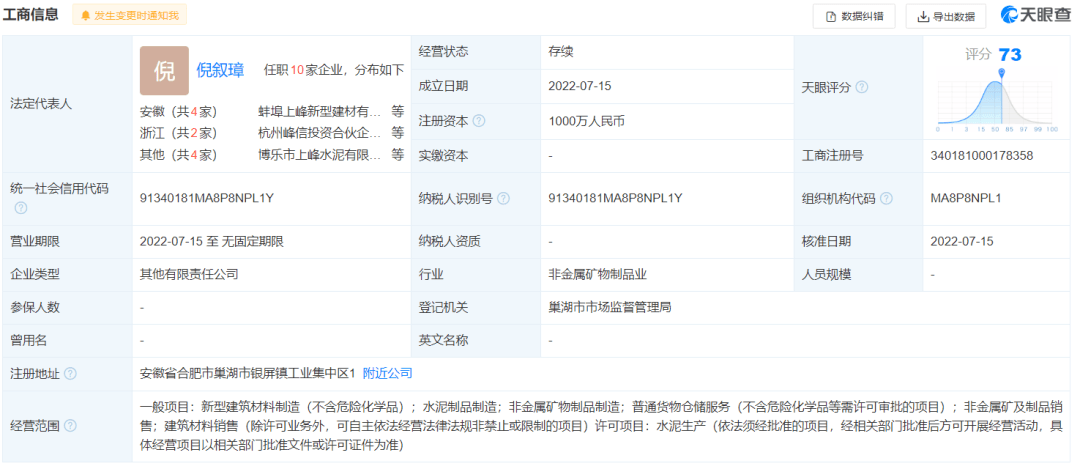 天眼查信息显示,7月15日,巢湖上峰恒信新型材料有限公司成立,法人倪叙璋。企业注册资本1000万元人民币,经营范围包含:一般项目:新型建筑材料制造(不含危险化学品);水泥制品制造;非金属矿物制品制造;普通货物仓储服务(不含危险化学品等需许可审批的项目);非金属矿及制品销售;建筑材料销售(除许可业务外,可自主依法经营法律法规非禁止或限制的项目)许可项目:水泥生产(依法须经批准的项目,经相关部门批准后方可开展经营活动,具体经营项目以相关部门批准文件或许可证件为准)