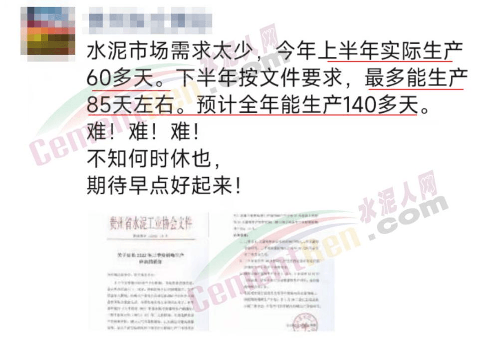 贵州某企业负责人反馈称,今年水泥市场需求太少,上半年实际生产60多天。按文件要求,下半年最多能生产85天左右,预计全年能生产140多天。