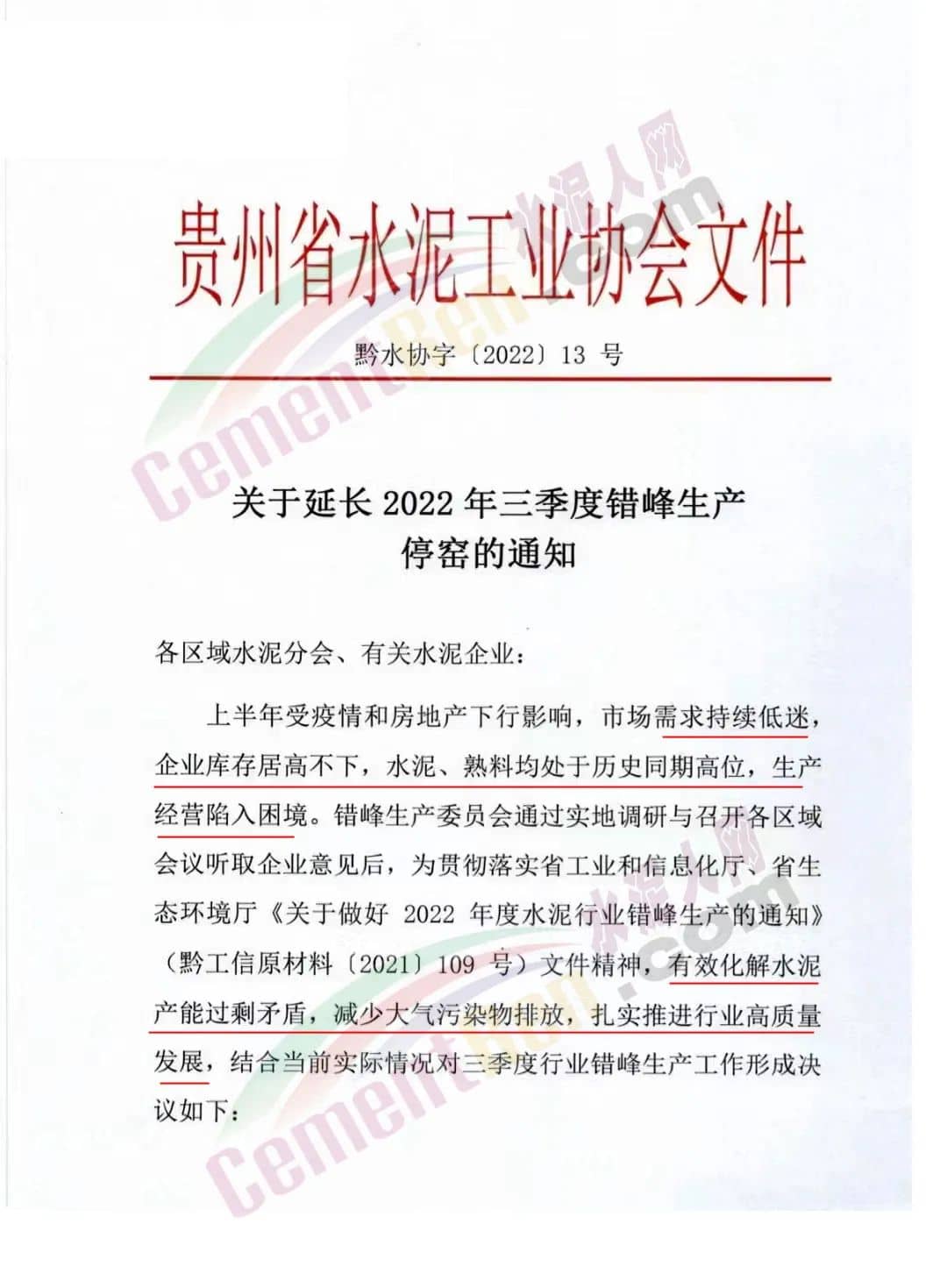 贵州省水泥工业协会发布的《关于延长2022年三季度错峰生产停窑的通知》中也有提到,上半年受疫情和房地产下行影响,市场需求持续低迷,企业库存居高不下,水泥、熟料均处于历史同期高位,生产经营陷入困境。
