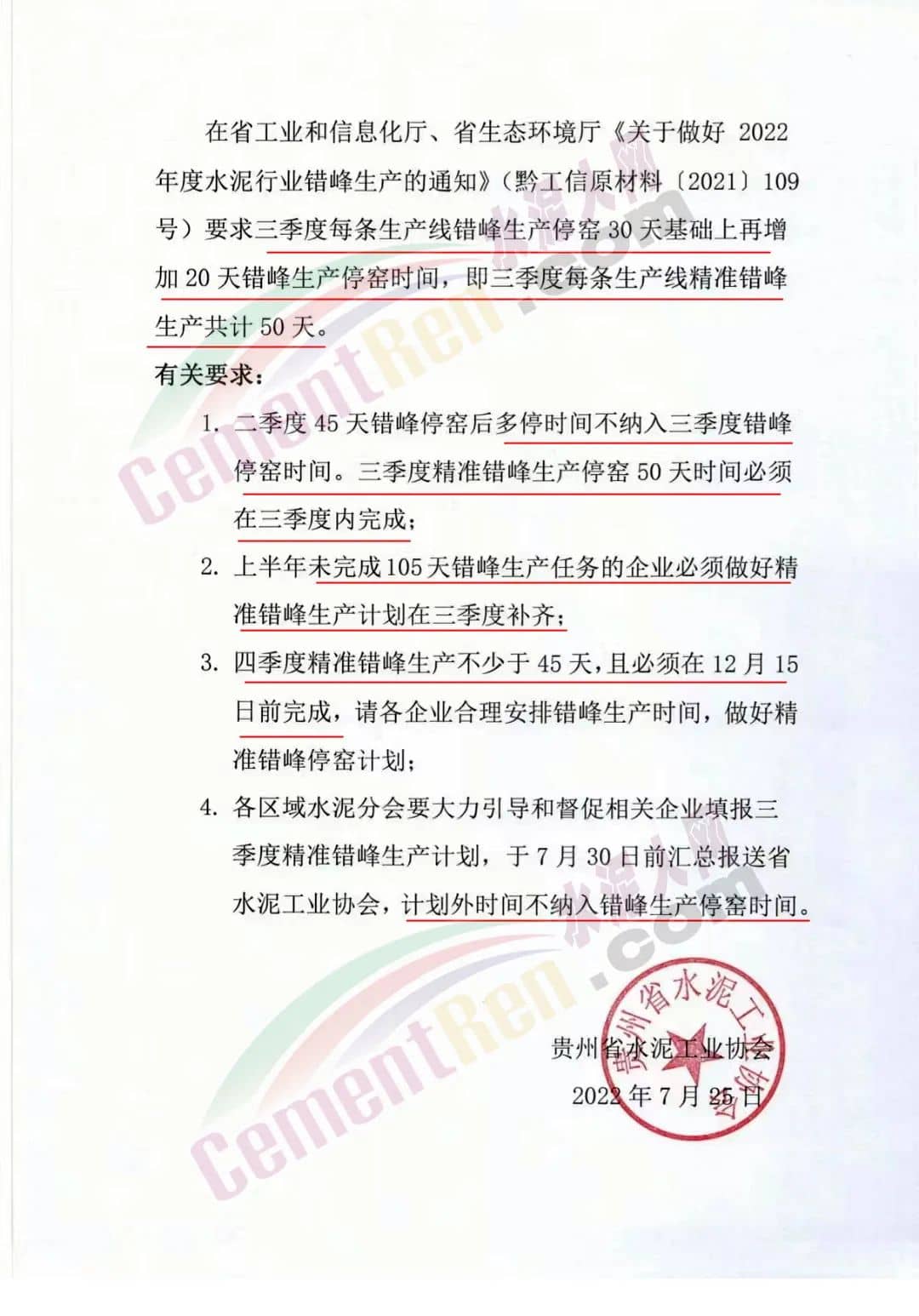 日前,贵州省水泥工业协会发布《关于延长2022年三季度错峰生产停窑的通知》要求三季度在每条生产线错峰生产停窑30天基础上再增加20天错峰生产停窑时间,即三季度每条生产线精准错峰生产共计50天。