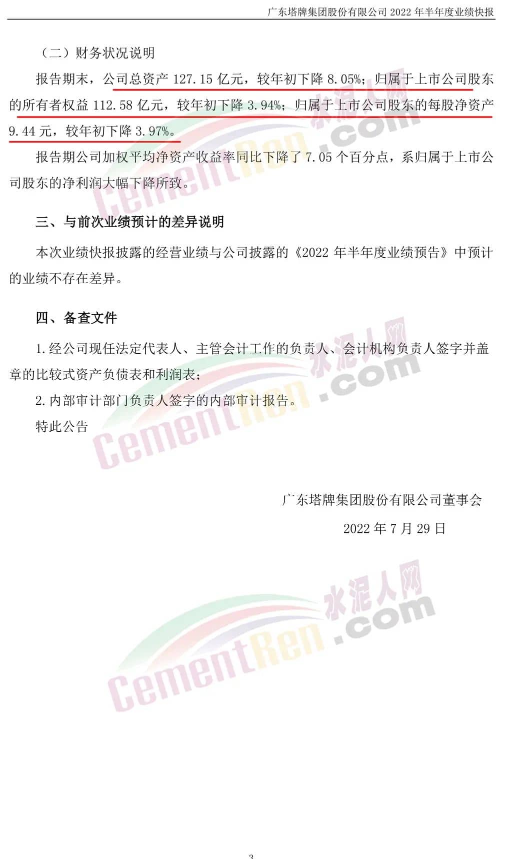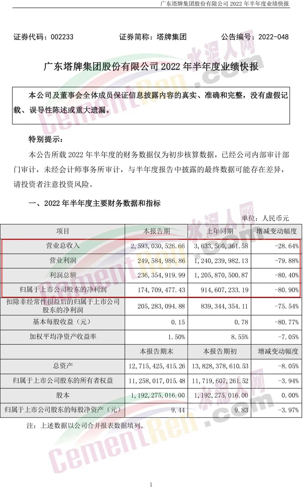 塔牌集团(002233)7月28日晚间发布业绩快报,2022年半年度营业收入为25.93亿元,同比下滑28.64%;归母净利润1.75亿元,同比下滑80.9%;基本每股收益0.15元。