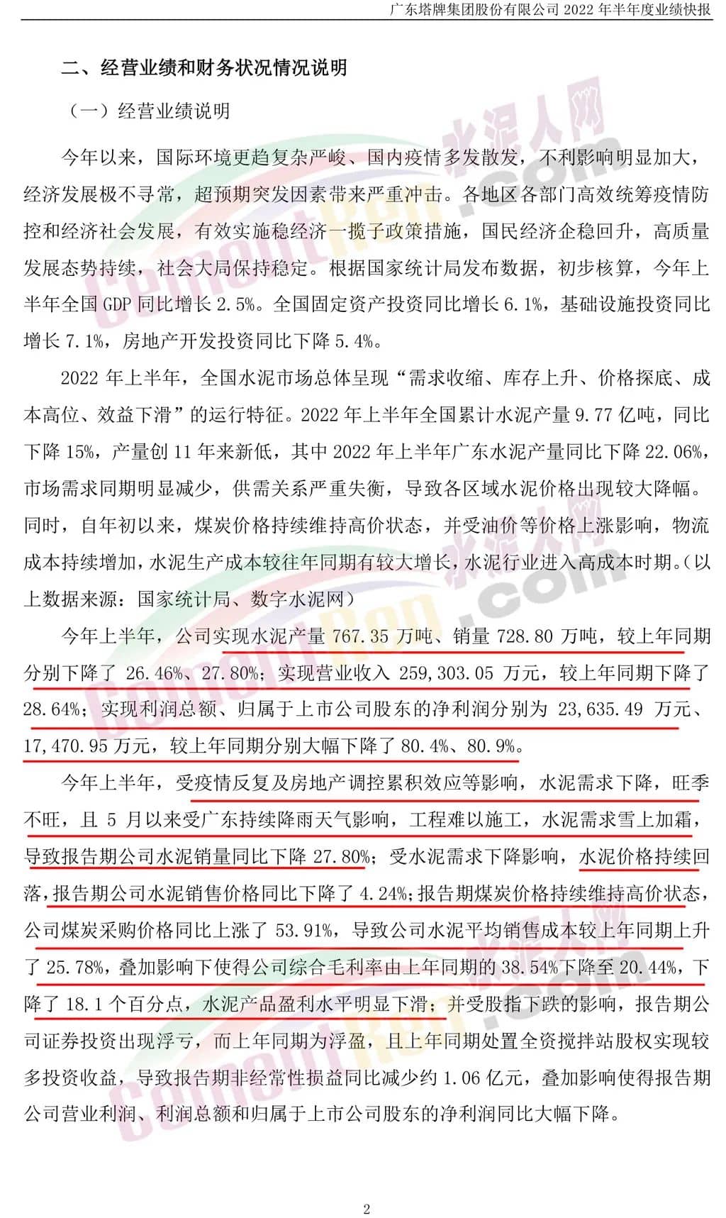 今年上半年,受疫情反复及房地产调控累积效应等影响,水泥需求下降,旺季不旺,且5月以来受广东持续降雨天气影响,工程难以施工,水泥需求雪上加霜,导致报告期公司水泥销量同比下降27.80%;受水泥需求下降影响,水泥价格持续回落,报告期公司水泥销售价格同比下降了4.24%;报告期煤炭价格持续维持高价状态,导致公司水泥平均销售成本较上年同期上升了25.78%。