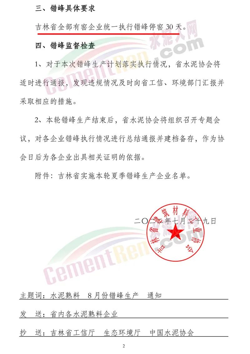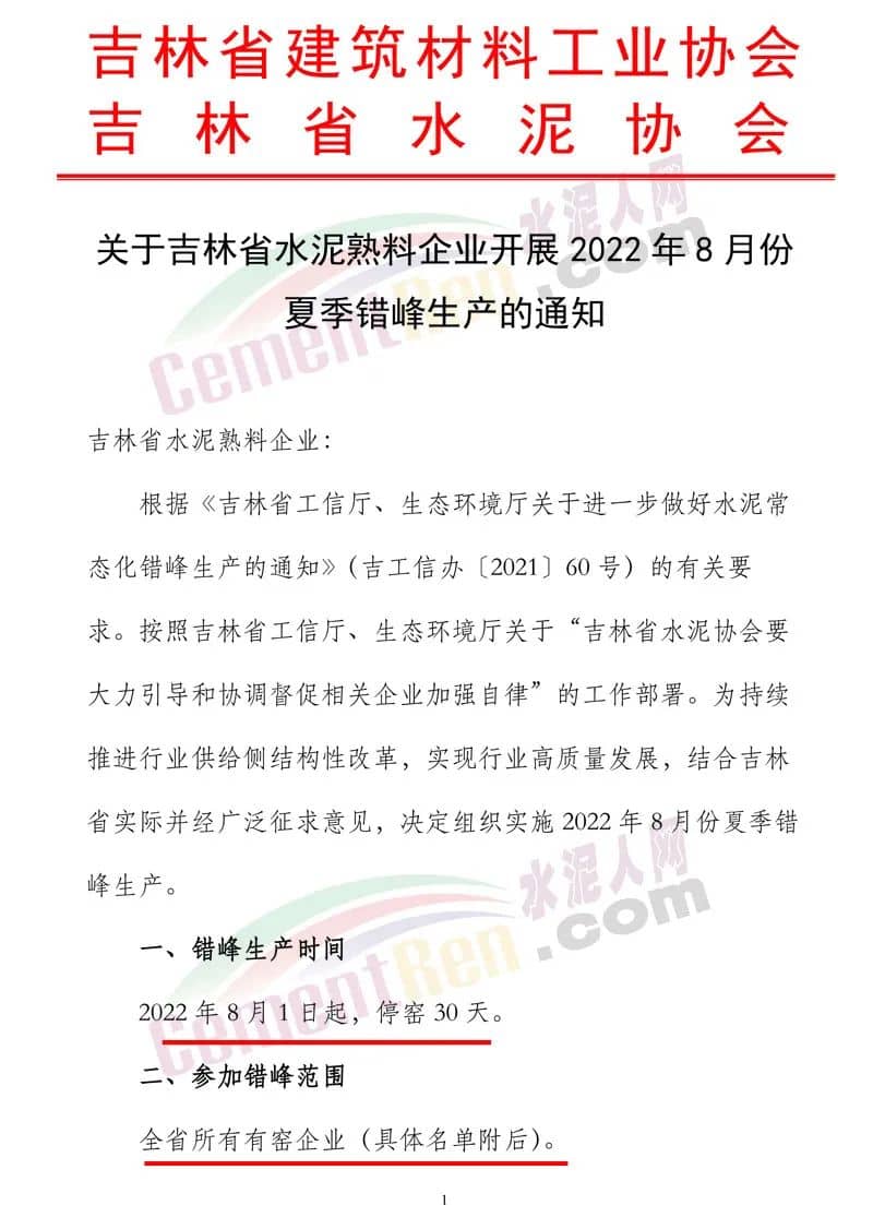 吉林省建筑材料工业协会吉林省水泥协会发布《关于吉林省水泥熟料企业开展2022年8月份夏季错峰生产的通知)给吉林省水泥熟料企业要求实施2022年8月份夏季错峰生产。