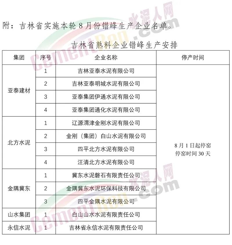 吉林省实施8月份错峰生产企业名单中包括亚泰建材、北方水泥、金隅冀东、山水集团、永信水泥等5家企业。