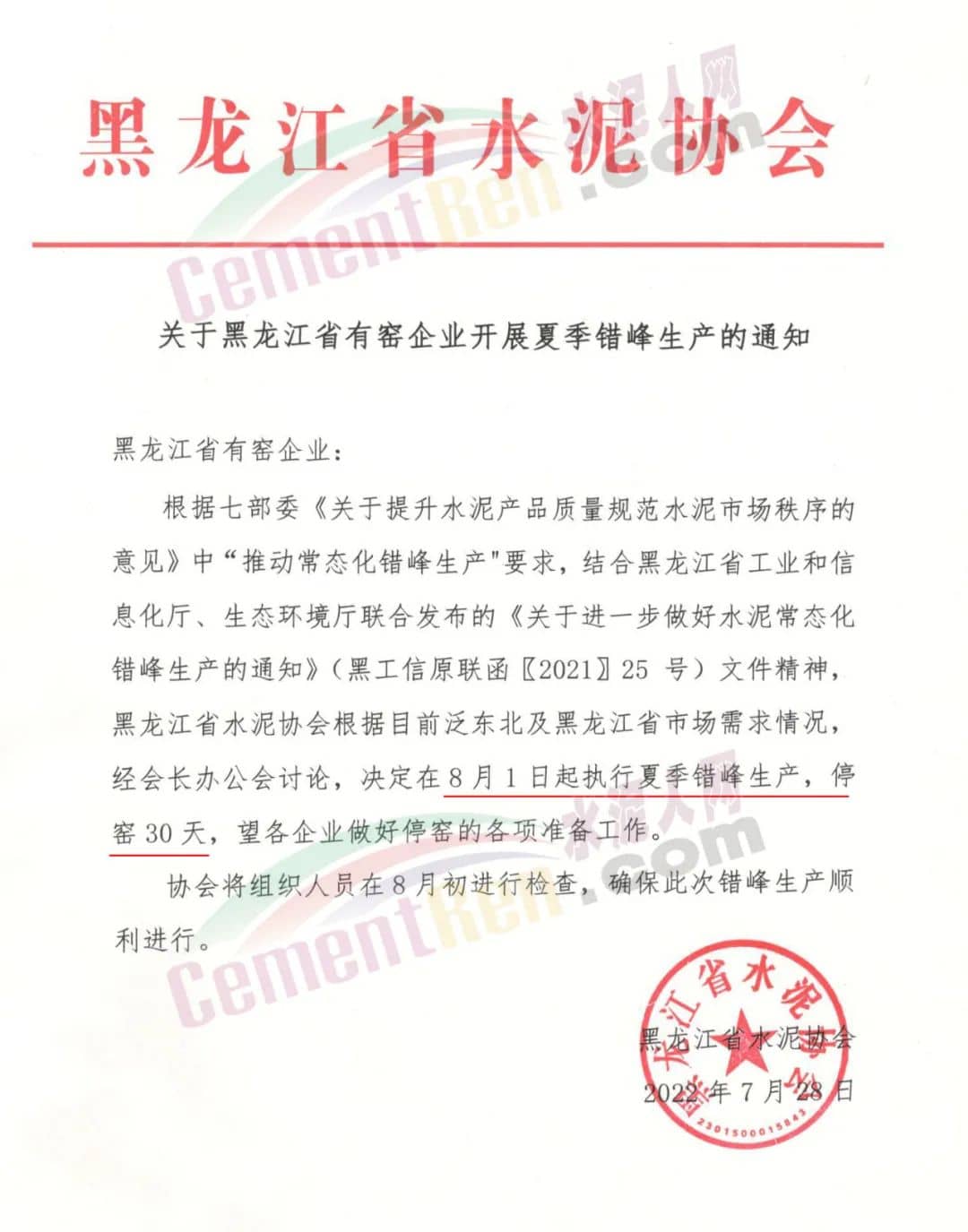 黑龙江省水泥协会发布《关于黑龙江省有窑企业开展夏季错峰生产的通知》给黑龙江省有窑企业要求自在8月1日起执行夏季错峰生产,停窑30天。