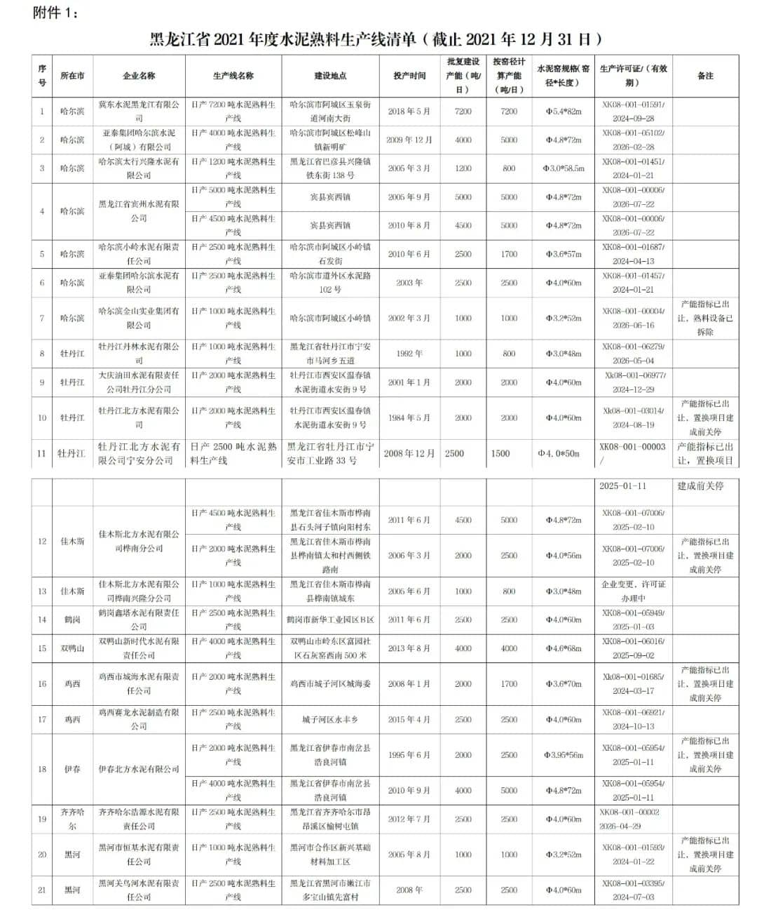 黑龙江工信厅近期发布的水泥熟料生产线清单可见,黑龙江省截止2021年12月31日21家熟料生产企业共有23线熟料生产线。