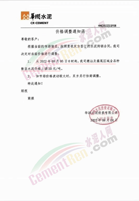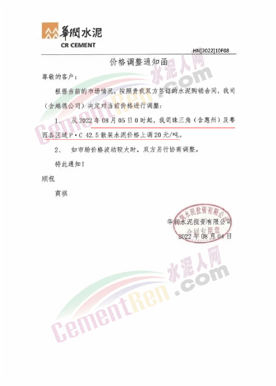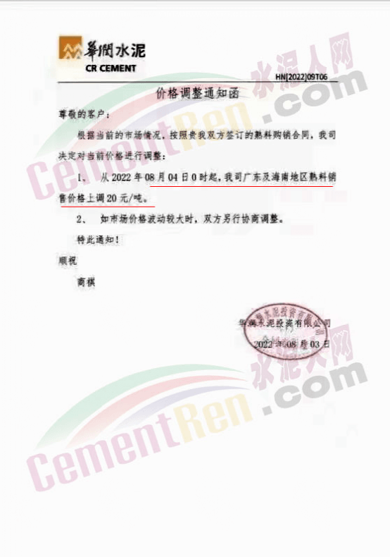 水泥人网通讯员消息,日前,华润水泥投资有限公司通知,从8月4日0时起,公司广东及海南地区熟料销售价格上调20元/吨。潮汕及揭尾区域全品种散装水泥,珠三角(含惠州)及粤西各区域P.C42.5散装水泥价格同步上调20元/吨。