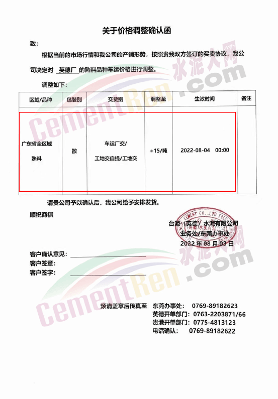 同期,台泥(英德)水泥有限公司通知,广东省全区域熟料价格自8月4日0时起上调15元/吨。