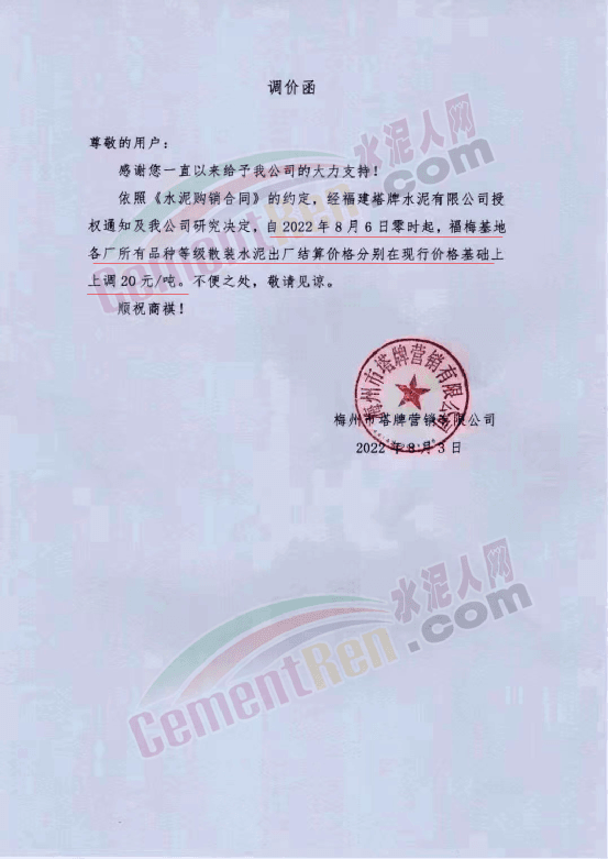 同期梅州市塔牌营有限公司通知,自8月6日零时起,福梅基地各厂所有品种等级散装水泥出厂结算价格分别在现行价格基础上上调20元/吨。