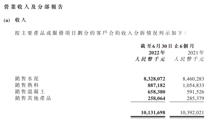 2022年上半年,山水水泥持续致力于细化内部基础管理,以提升现有生产运营质量和可持续盈利能力。截至2022年6月30日,水泥产能9,679万吨,熟料产能5,047万吨,商品混凝土产能1,710万立方米。报告期内,本集团销售水泥、熟料合计23,848,471吨,同比减少18.2%;销售商品混凝土1,512,000立方米,同比增加4.0%;营业收入人民币10,131,698,000元,同比减少2.5%;本期盈利人民币468,716,000元,同比减少62.5%。