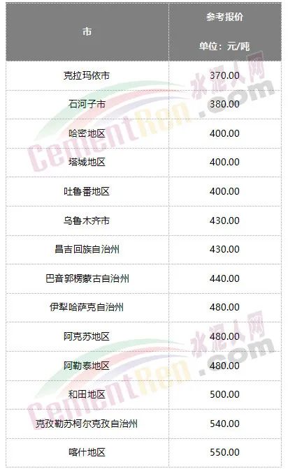据水泥人网信息中心数据,新疆维吾尔自治区内主要品牌企业P.O42.5散装水泥挂牌价在370~550元/吨之间,差价达180~360元/吨。