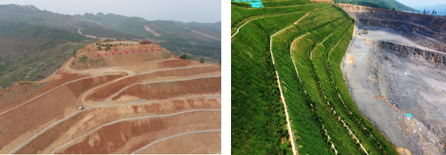 岚沟石灰岩露采边坡矿植被恢复施工前后对比图