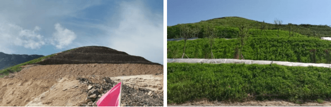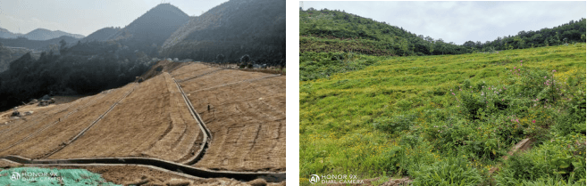 为此,芷兰生态首先对嵯峨山项目区附近的乡土植物进行了调研,再运回公司基地进行筛选与培育,并对乔、灌、草进行配比,最后采用“三网一板一巢”的工艺技术,对其进行修复,如下是修复前后的对比图。