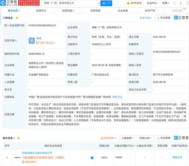 企查查APP显示,8月9日,海螺(广西)控股有限公司成立,法定代表人为陶勇,注册资本1亿元人民币,经营范围包含:水泥制品制造;新型建筑材料制造(不含危险化学品);轻质建筑材料制造;煤炭及制品销售等。企查查股权穿透显示,该公司由海螺水泥100%控股。