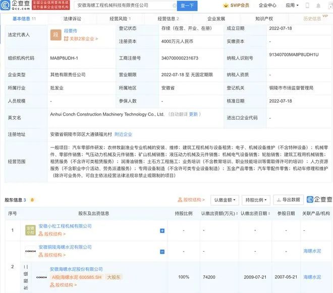据查询,集团集团旗下近日还新增了一家名为安徽海螺工程机械科技有限责任公司的企业,法定代表人为段要传,成立日期为2022年7月18日,注册资本4000万元人民币,经营范围包含:汽车零部件研发;农林牧副渔业专业机械的安装、维修;气压动力机械及元件销售;矿山机械销售等。企查查股权穿透显示,该公司由海螺水泥全资子公司安徽铜陵海螺水泥有限公司等共同持股。