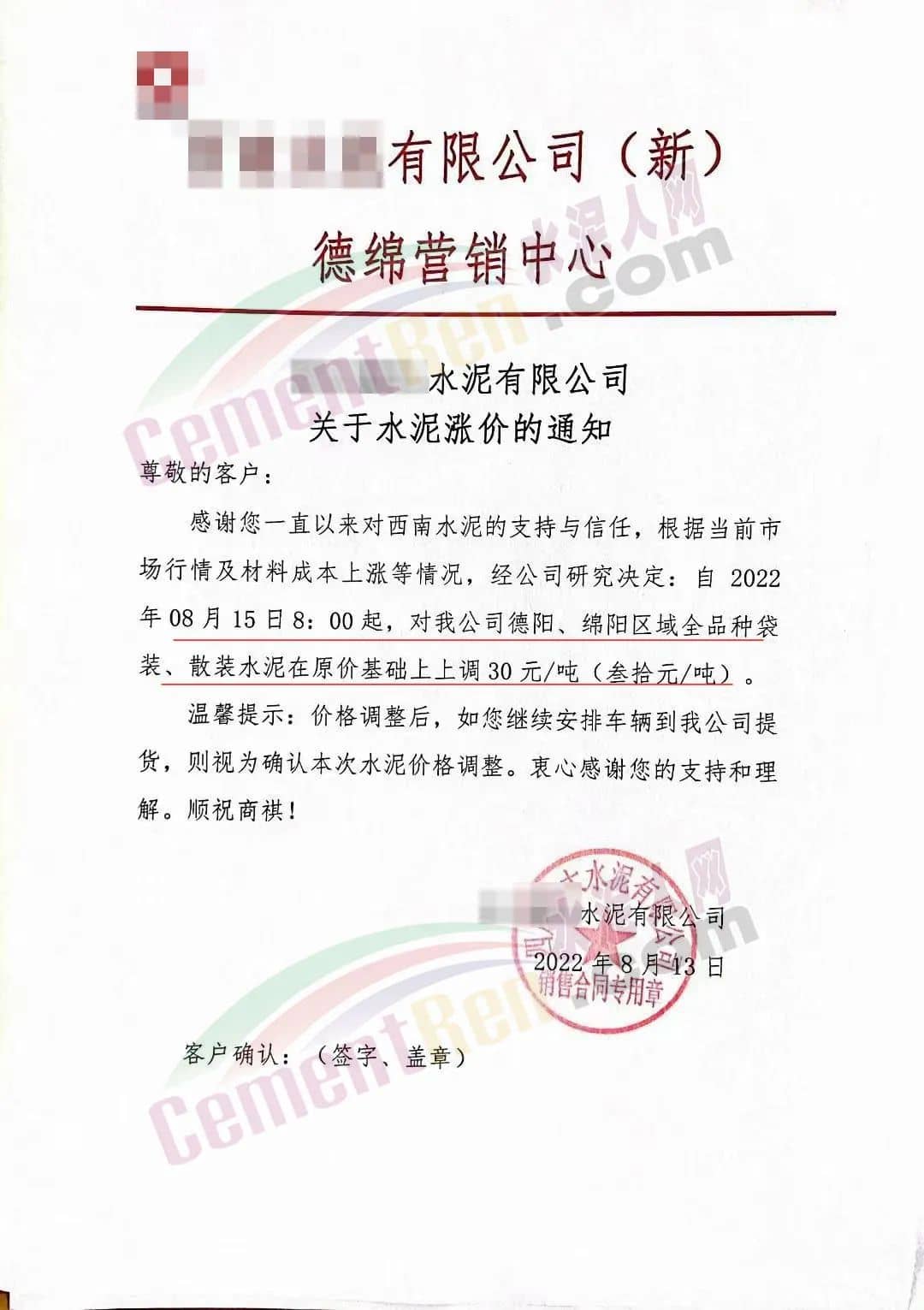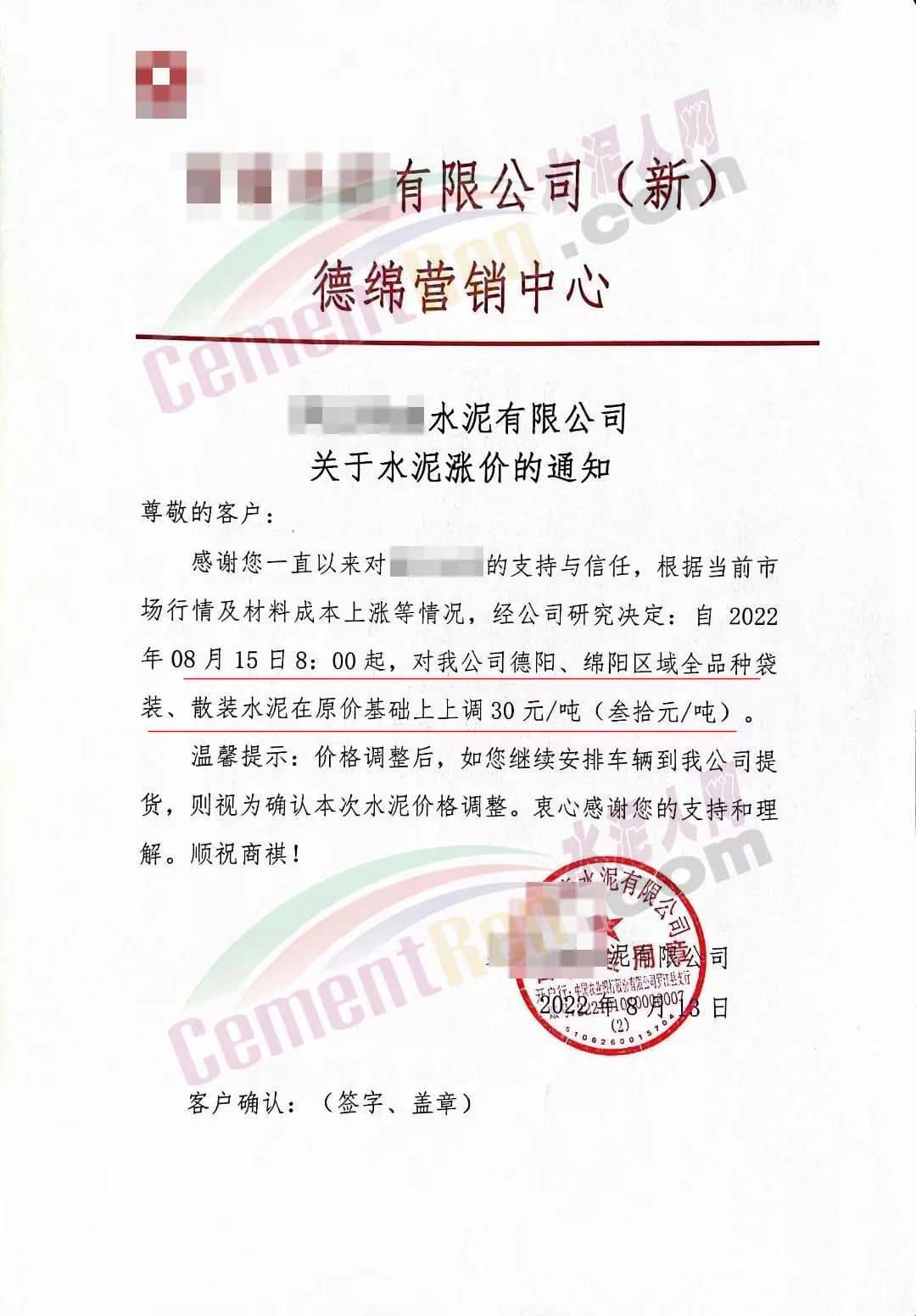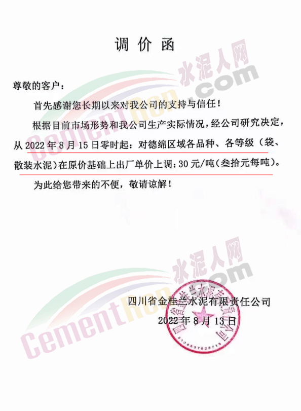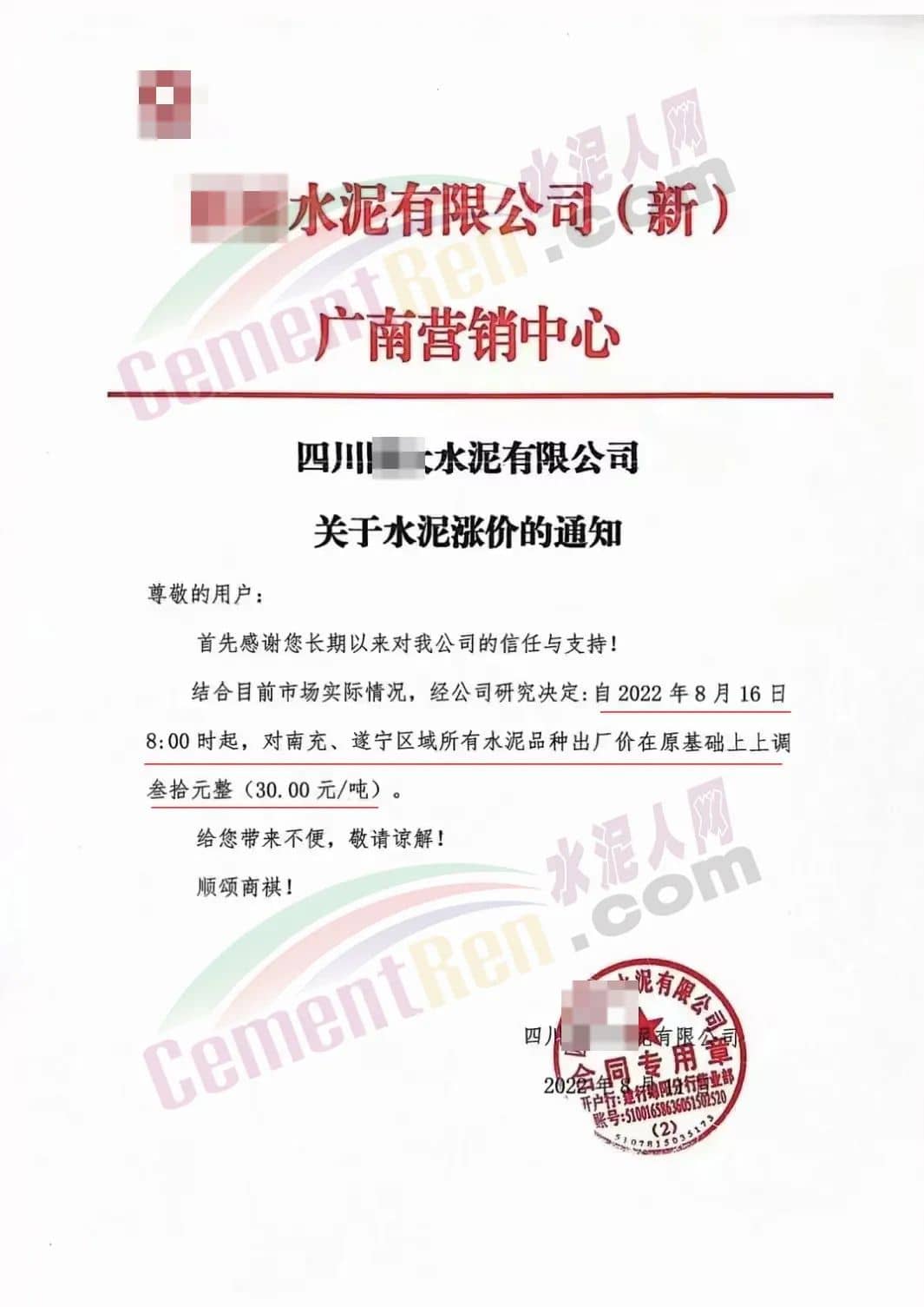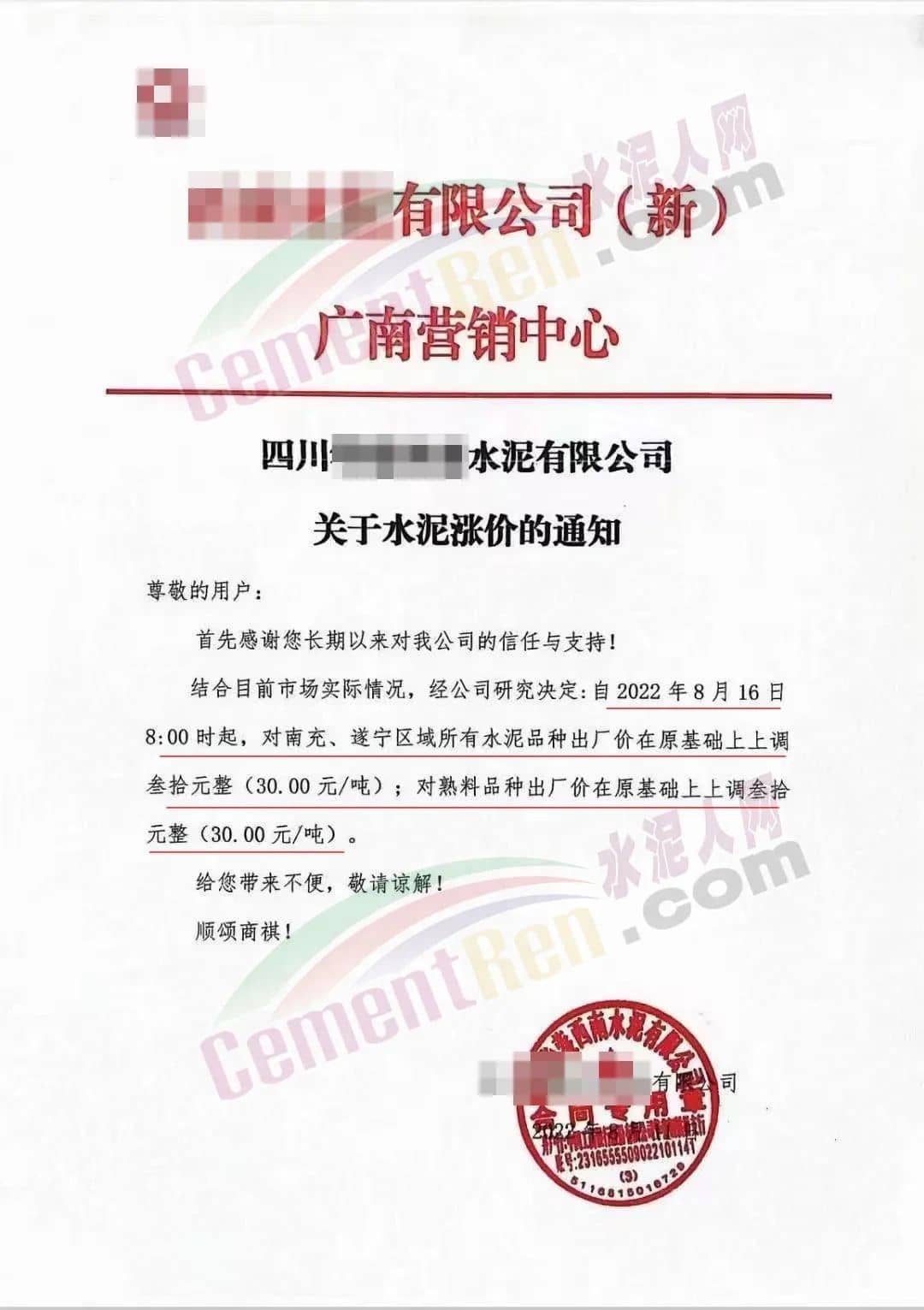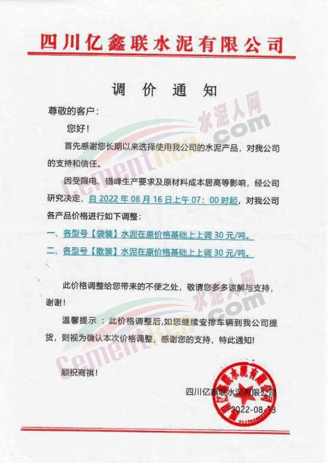 四川亿鑫联水泥有限公司自8月16日上午7时起,对公司各产品价格上调30元/吨。