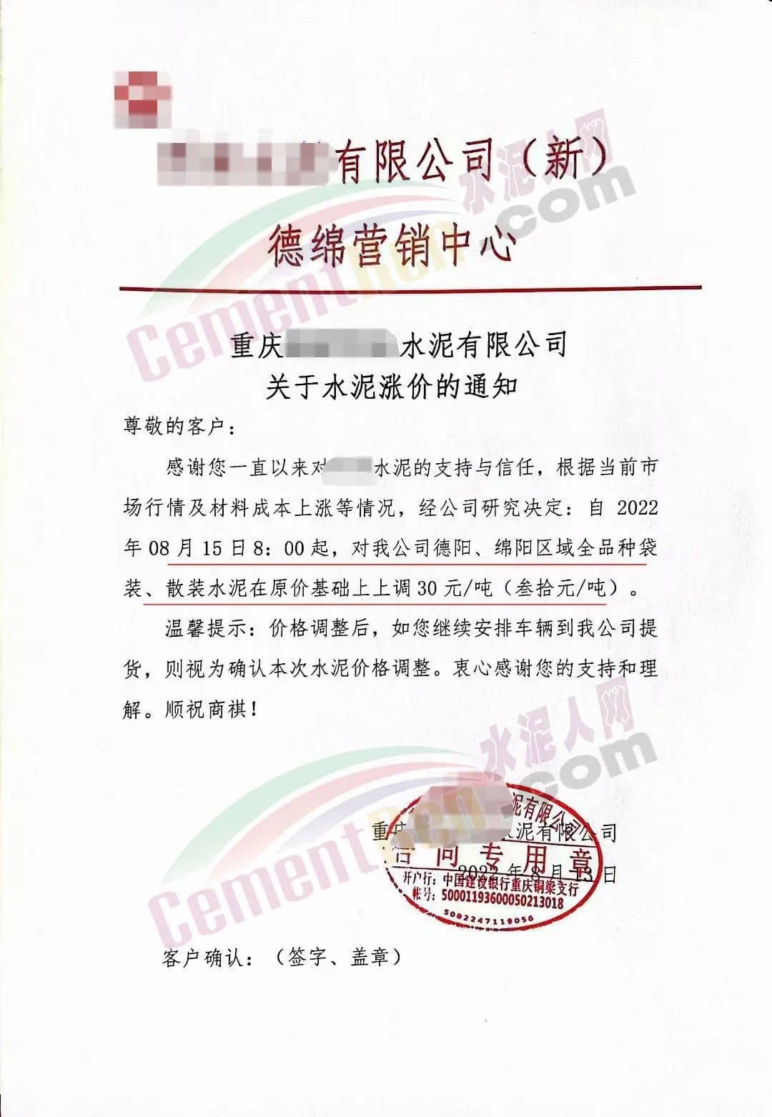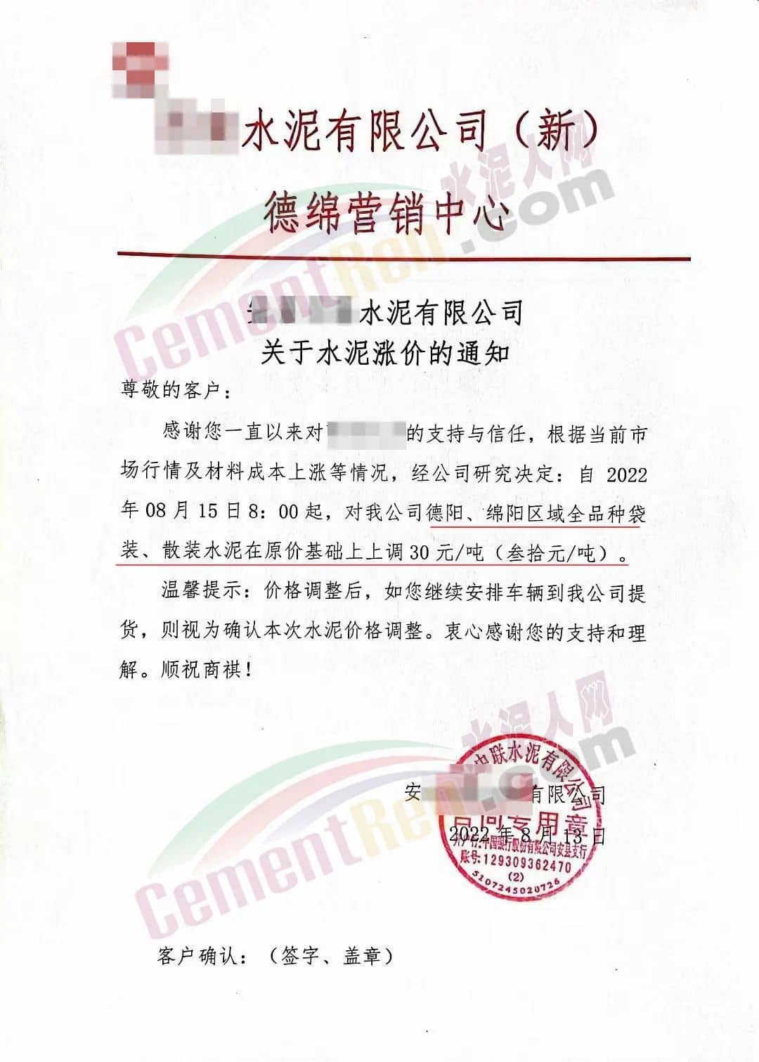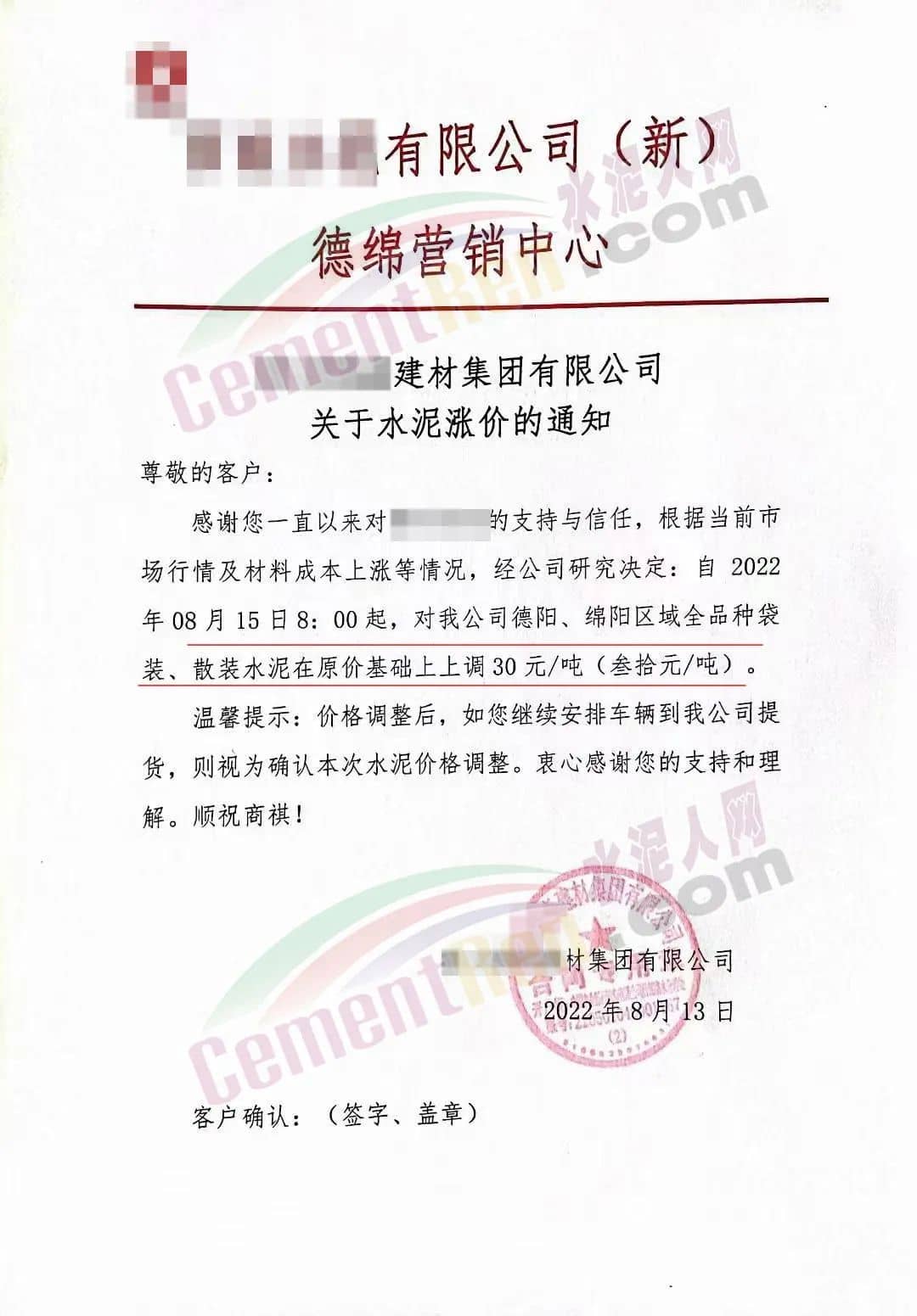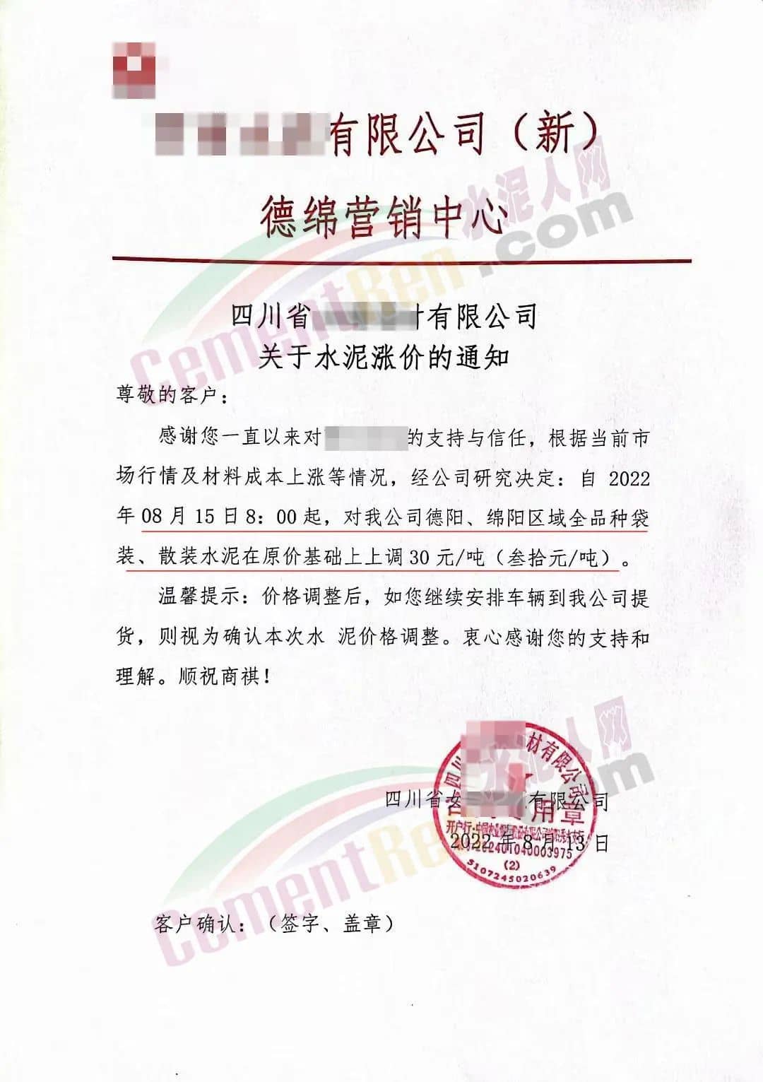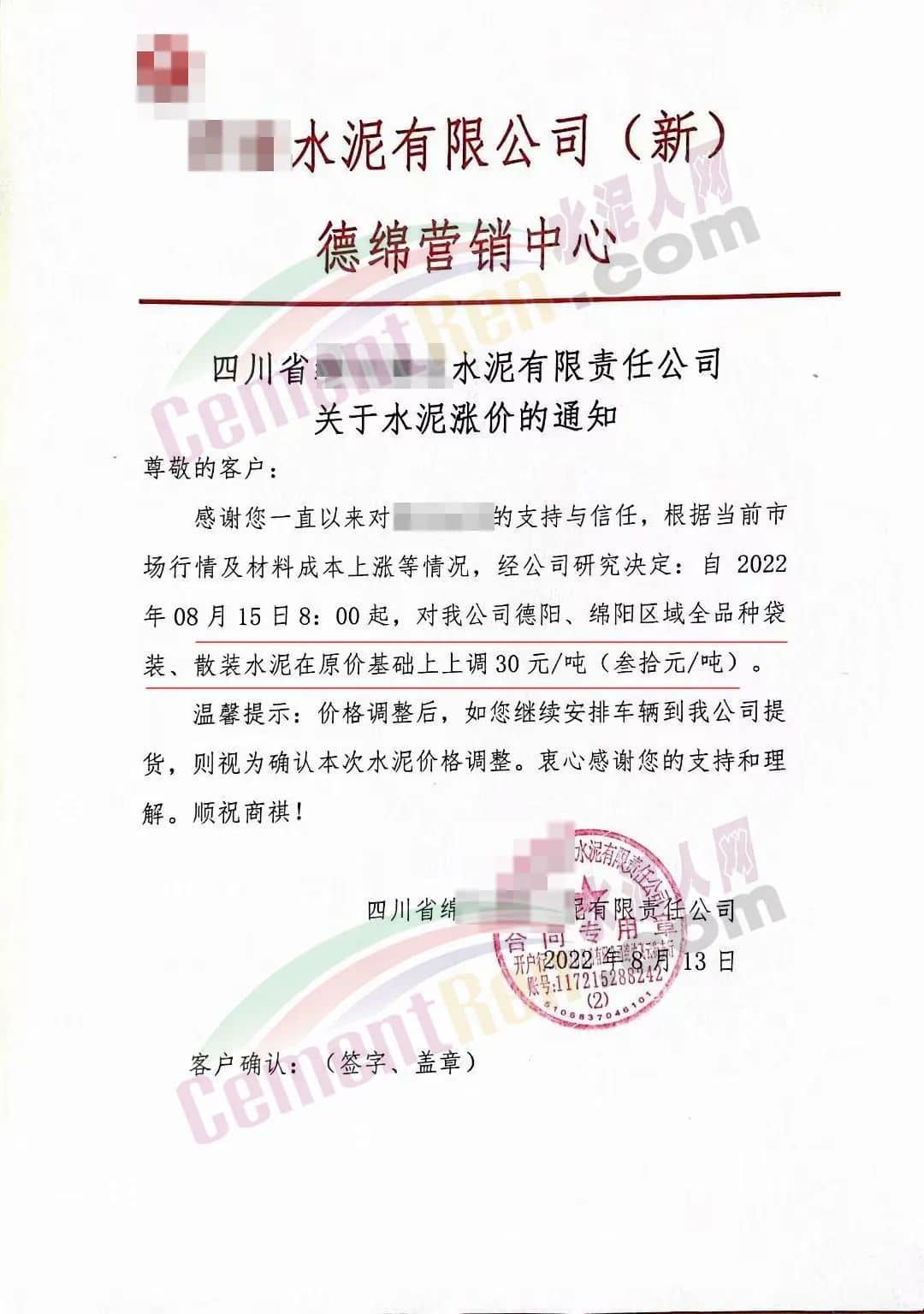 四川亿鑫联水泥有限公司自8月16日上午7时起,对公司各产品价格上调30元/吨。