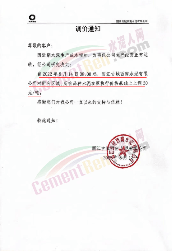 日前,丽江古城西南水泥有限公司通知,因近期水泥生产成本增加,为确保公司生产经营正常运转,经公司研究决定,自8月14日8时起,公司对所有区域、所有品种水泥在原执行价格基础上上调30元/吨。