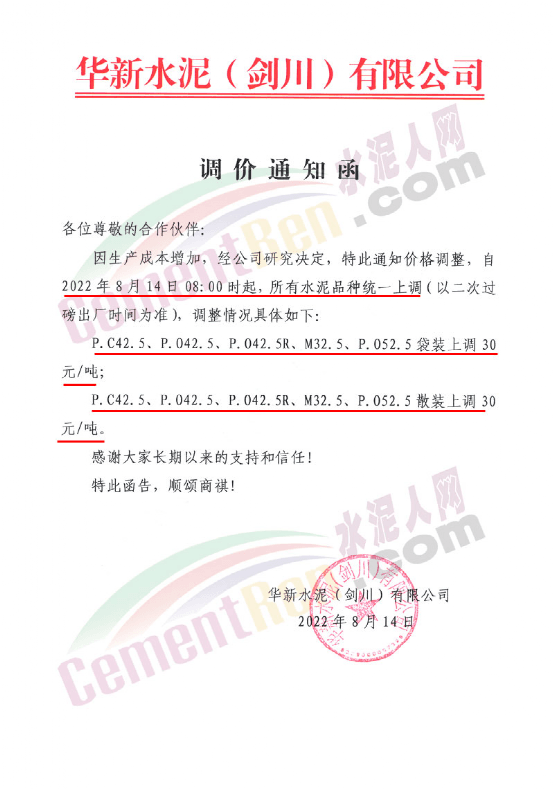 华新水泥(剑川)有限公司通知,因生产成本增加,经公司研究决定自8月14日8时起,所有水泥品种统一上调30元/吨。