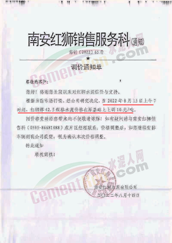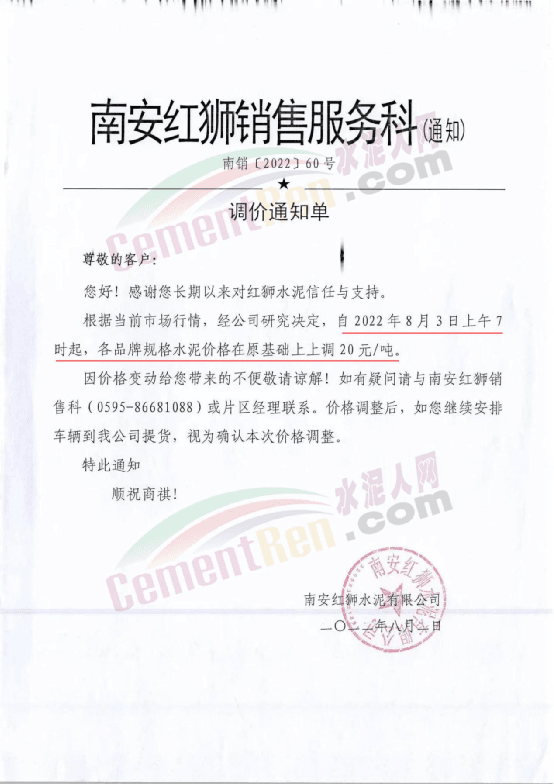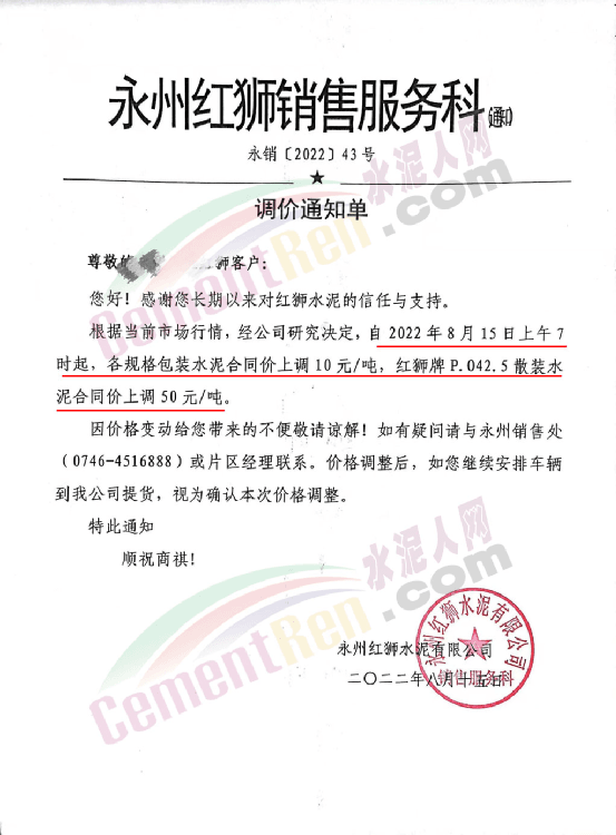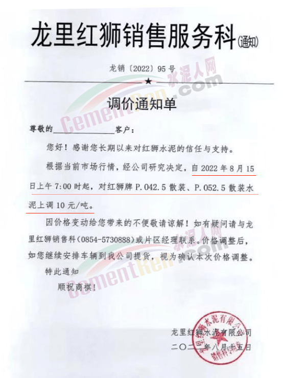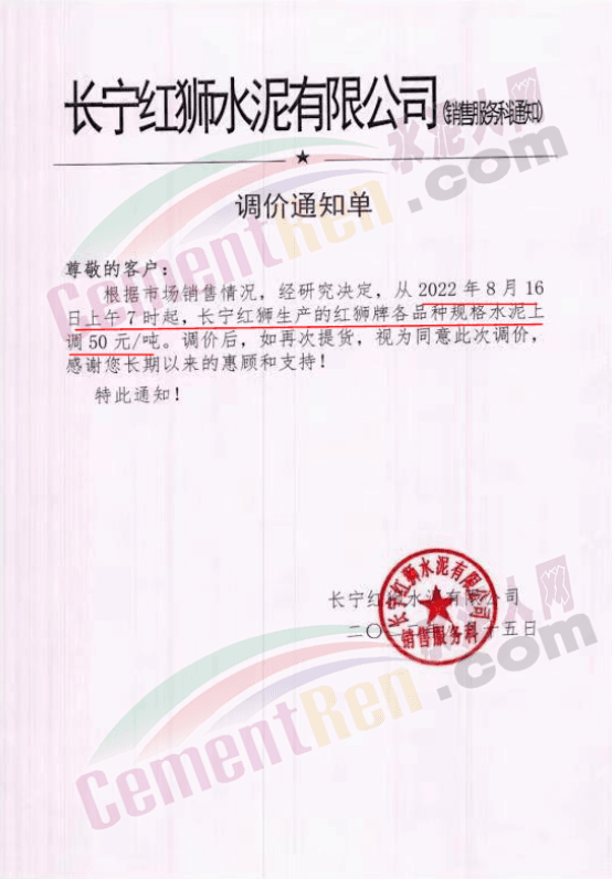 长宁红狮水泥有限公司销售服务科通知根据市场销售情况,经研究决定,从2022年8月16日上午7时起,长宁红狮生产的红狮牌各品种规格水泥上调50元/吨。调价后,如再次提货,视为同意此次调价。
