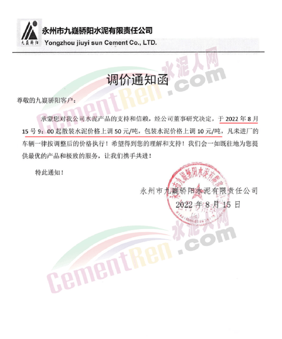 永州市九嶷骄阳水泥有限责任公司通知于2022年8月15号9∶00起散装水泥价格上调50元/吨,包装水泥价格上调10元/吨,凡未进厂的车辆一律按调整后的价格执行!