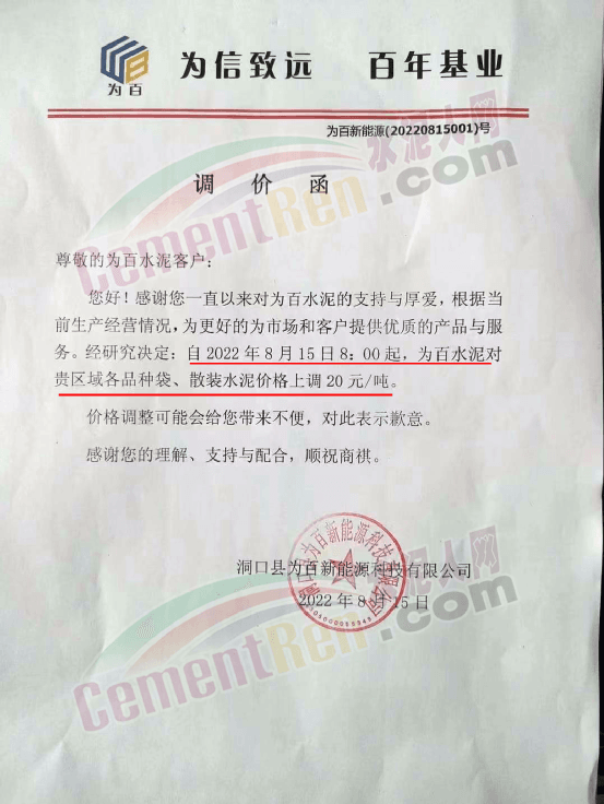 湖南洞口县为百新能源科技有限公司通知,根据当前生产经营情况,自8月15日8时起,为百水泥对各品种袋、散装水泥价格上调20元/吨。