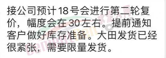 水泥销售通知,接公司通知预计18日会进行第二轮复价,幅度会在30元/吨左右。提前通知客户做好库存准备,大田红狮发货已经需要限量发货。