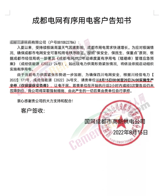 据水泥人网了解,国网成都市高新供电公司发布《成都电网有序用电客户告知书》称,入夏以来,受持续极端高温天气因素影响,成都市用电需求快速增长。为应对极端情况,确保成都市电网安全可靠和用电秩序稳定,按照“保安全、保民生、保重点”原则,根据成都市经信局统一一部署及相关文件要求,如出现电力供需形势紧张情况,将依法依规启动组织实施有序用电。
