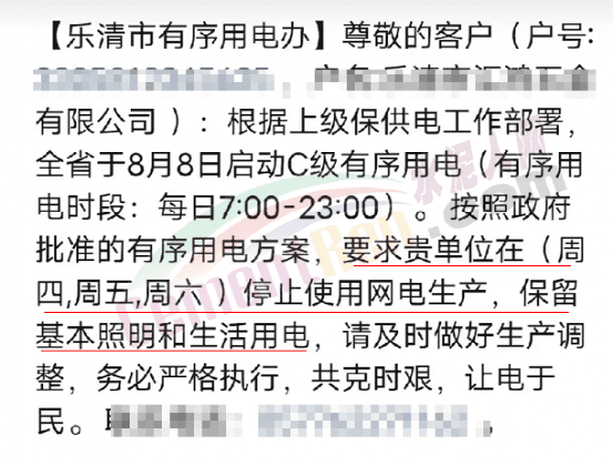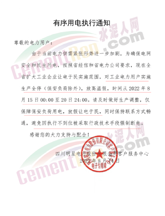 四川明星电力股份有限公司客户服务中心发《有序用电执行通知》给电力用户称,由于当前电力供需紧张形势进一步加剧,为确保电网安全和民生用电,按照省经信和省电力公司要求,现在全省扩大工业企业让电于民实施范围,对工业电力用户实施生产全停(保安负荷除外),放高温假,时间从2022年8月15日00∶00至20日24∶00。请及时做好生产调整,仅保障保安负荷用电,放假让电于民,同时保持联系方式畅通,避免因执行不到位被采取行政技术手段强制断电。