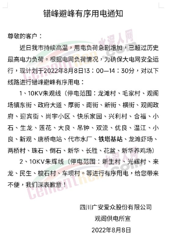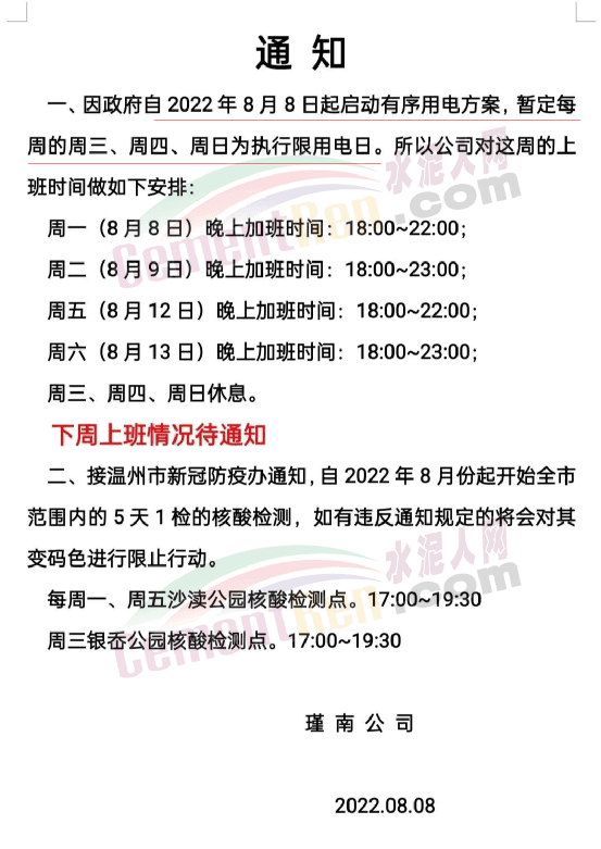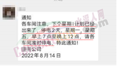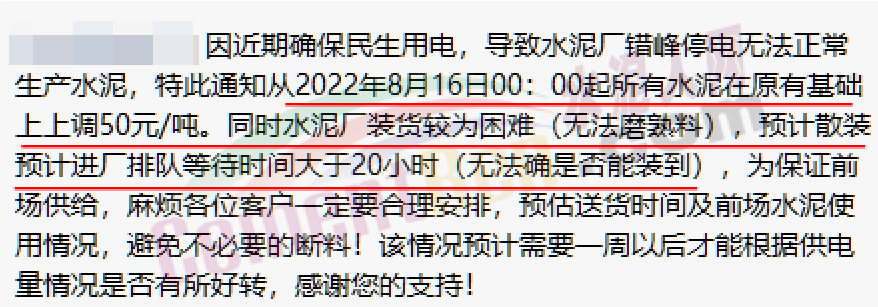 区域内一家水泥企业紧急通知,因近期确保民生用电,导致水泥厂错峰停电无法正常生产水泥,特此通知!从2022年8月16日00:00起所有水泥在原有基础上上调50元/吨。同时水泥厂装货较为困难(无法磨熟料),预计散装预计进厂排队等待时间大于20小时(无法确是否能装到),为保证前场供给,麻烦各位客户一定要合理安排,预估送货时间及前场水泥使用情况,避免不必要的断料。该情况预计需要一周以后才能根据供电量情况是否有所好转。