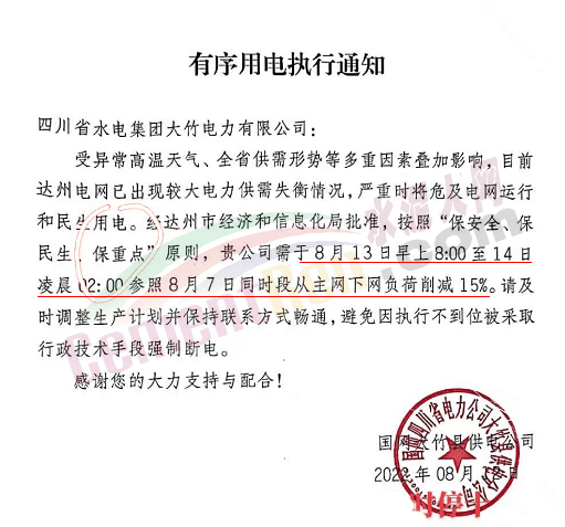 四川省水电集团大竹电力有限公司发布《有序用电执行通知》称,受异常高温天气、全省供需形势等多重因素叠加影响,目前达州电网已出现较大电力供需失衡情况,严重时将危及电网运行和民生用电。经达州市经济和信息化局批准,按照“保安全、保民生(保重点”原则,贵公司需于8月13日早上8∶00至14日凌晨2∶00参照8月7日同时段从主网下网负荷削减15%。请及时调整生产计划并保持联系方式畅通,避免因执行不到位被采取行政技术手段强制断电。