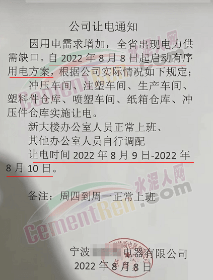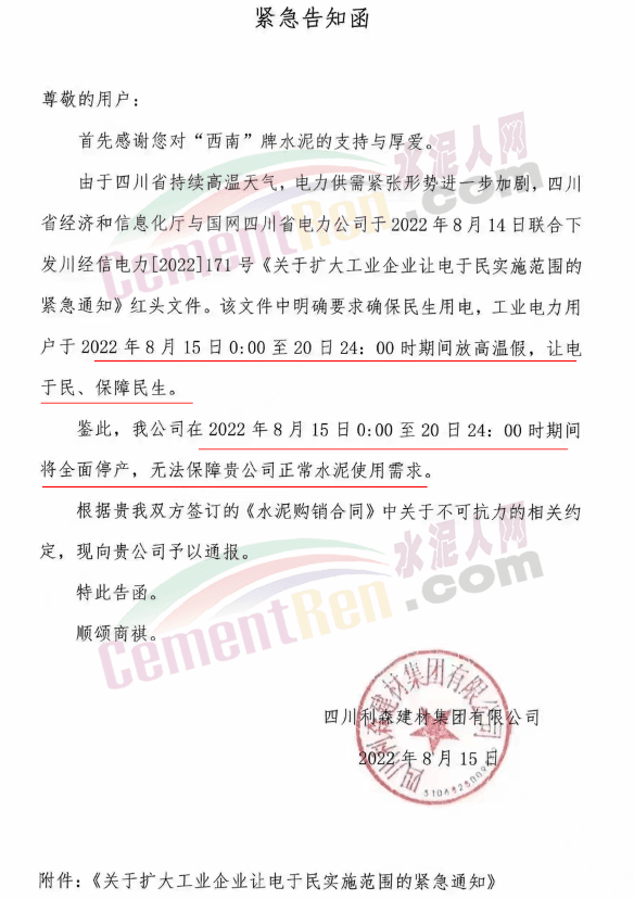 四川峨眉山西南水泥有限公司发《紧急告知函》称,由于四川省持续高温天气,电力供需紧张形势进一步加剧,四川省经济和信息化厅与国网四川省电力公司于2022年8月14日联合下发川经信电力[2022]171号《关于扩大工业企业让电于民实施范围的紧急通知》红头文件,该文件明确要求确保民生用电,工业电力用户于2022年8月15日00:00时至20日24:00时间高温假,让电于民。鉴此,公司在2022年8月15日00:00时至20日24:00时期间将全面停工停产。