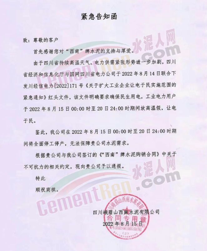 鉴此,公司在2022年8月15日0:00至20日24:00时期间将全面停产,无法保障客户正常水泥使用需求。根据贵我双方签订的《水泥购销合同》中关于不可抗力的相关约定,现向客户予以通报。