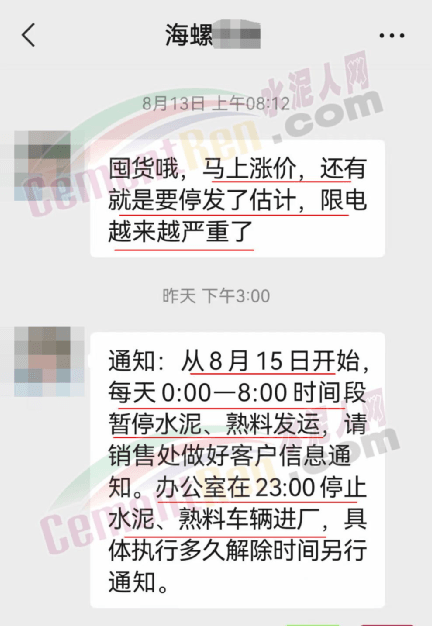 海螺水泥提醒经销商,“囤货哦,马上涨价,还有就是要停发了估计,限电越来越严重了。”并发出通知称:“从8月15日开始,每天0时至8时时间段暂停水泥、熟料发运,请销售处做好客户信息通知。办公室在23∶00停止水泥、熟料车辆进厂,具体执行多久解除时间另行通知。”